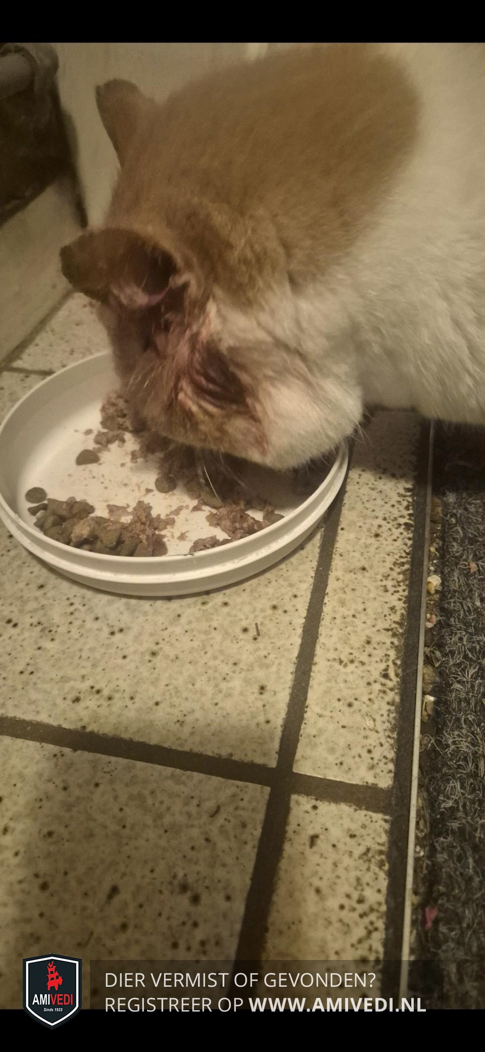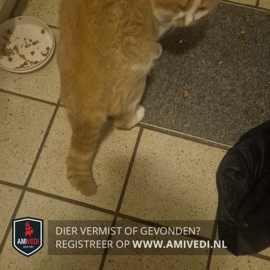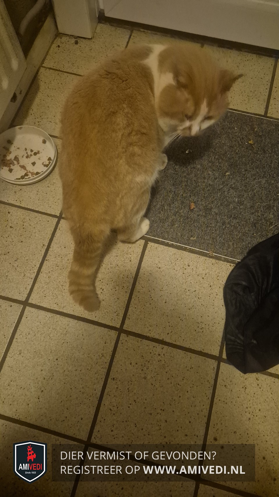 | Signalement | Rood-witte (cypers met wit) kat. Overwegend licht rood/oranje vacht met duidelijk wit op de borst, hals en snuit. Het gezicht heeft een witte bles die doorloopt over de neus. De poten zijn deels wit (witte “sokjes”). De staart is volledig rood/oranje en licht geringd |