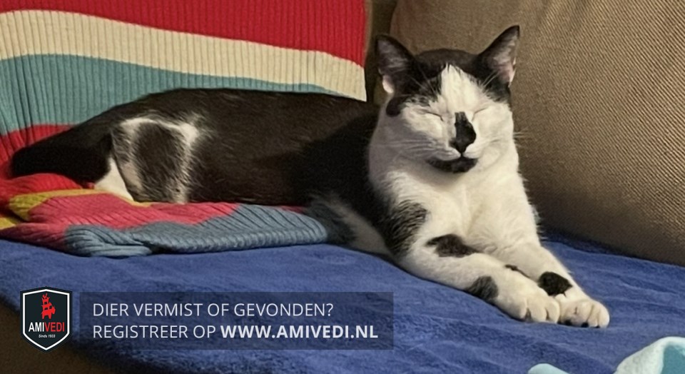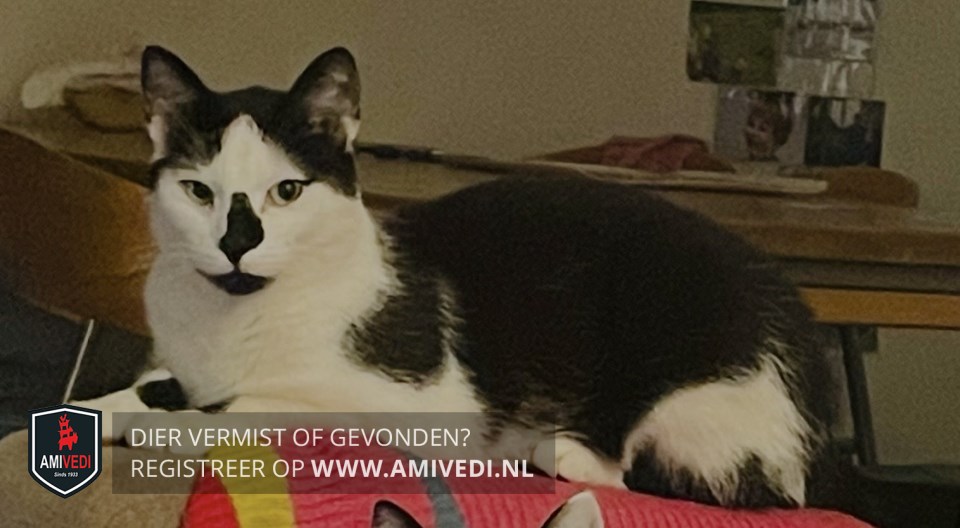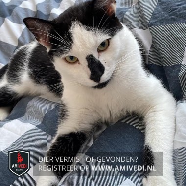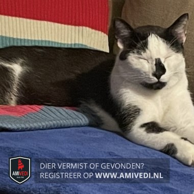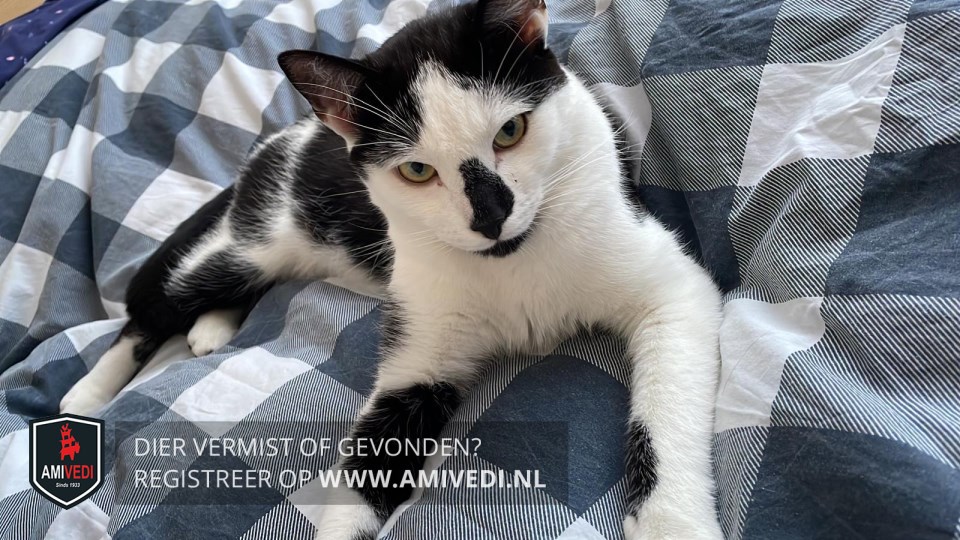 | Signalement | Zwarte streep op z’n neus. Zwarte onderkant bek. Op linkervoorpoot 2 zwarte plekken. Op linkerpoot 1 zwarte plek. Op rug en flanken zwarte plek. Achterkant wat zwarte vlekken. Zwarte staart. |