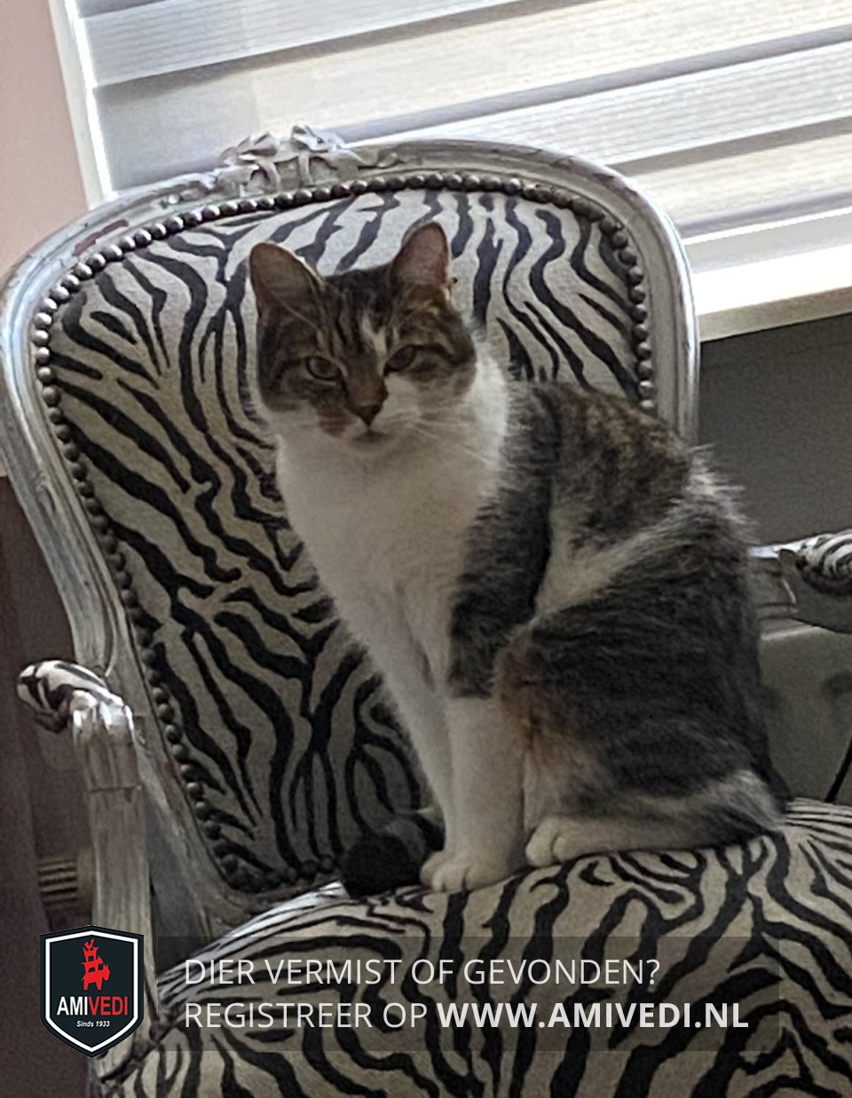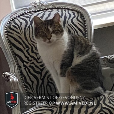 | Signalement | Cypers bruin/zwart met wit. Bruin/zwart bovenop de kop, incl. de oren, voorhoofd, rondom rechter oog, zijkant kop en loopt door tot en met de neus. Links van de kop bruin/zwart tot en met het oog. Witte verticale streep vanaf voorhoofd rechts langs het linker oog. Onder linker oog wit, loopt wit door rondom de bek. Witte kin, bef, borst en buik. Bruin/zwarte rug, halverwege de rug een witte streep vanaf de buik naar de rug. Bruin/zwarte onderrug en staart. Beide voorpoten wit. Hij heeft links boven zijn oog een botje wat een beetje uitsteekt dat voel je alleen als je hem daar aait anders zie je het niet. |
