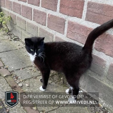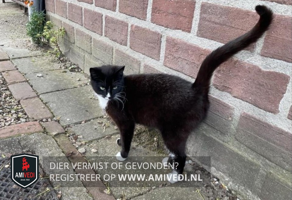 | Signalement | Zwart met een wit stipje op haar neus, witte bef, voor witte tenen en achter witte voetjes. |