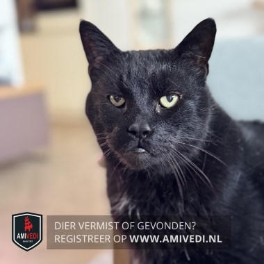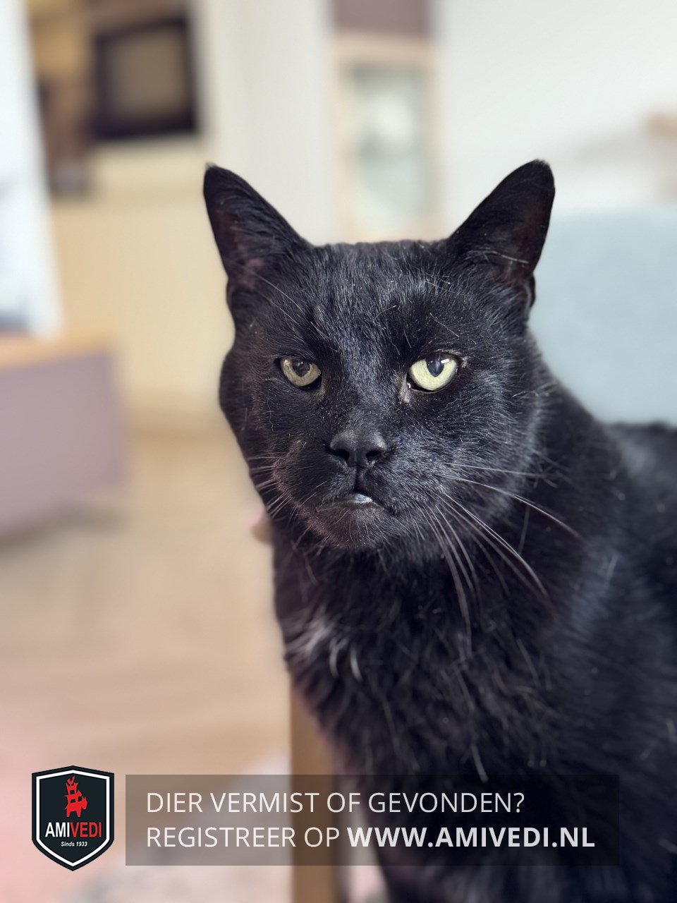 | Signalement | Geheel zwart met een paar witte haartjes op de bef. |