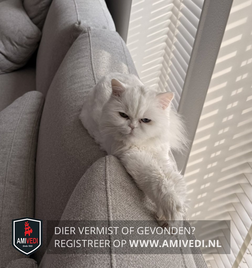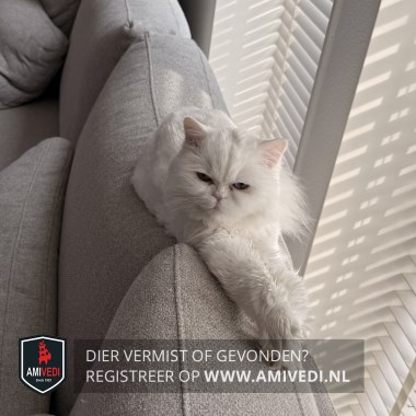 | Signalement | Geheel witte Perzische poes. Twee verschillende kleuren ogen. Blauw en groen. Ze heeft kortgeschoren haar. De staart is nog langharig. |
