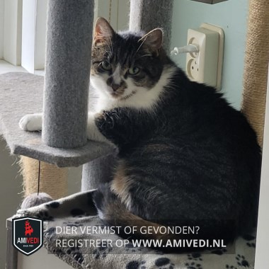 | Signalement | Bruin/zwart gestreept op de kop, wit streepje op de neus, bruine vlekjes rond de neus en onder de bek, witte kin, donker vlekje op de witte bef. Witte kraag, bruin/zwart gestreept op de rug en staart, witte voorpoten. Angstig! |
