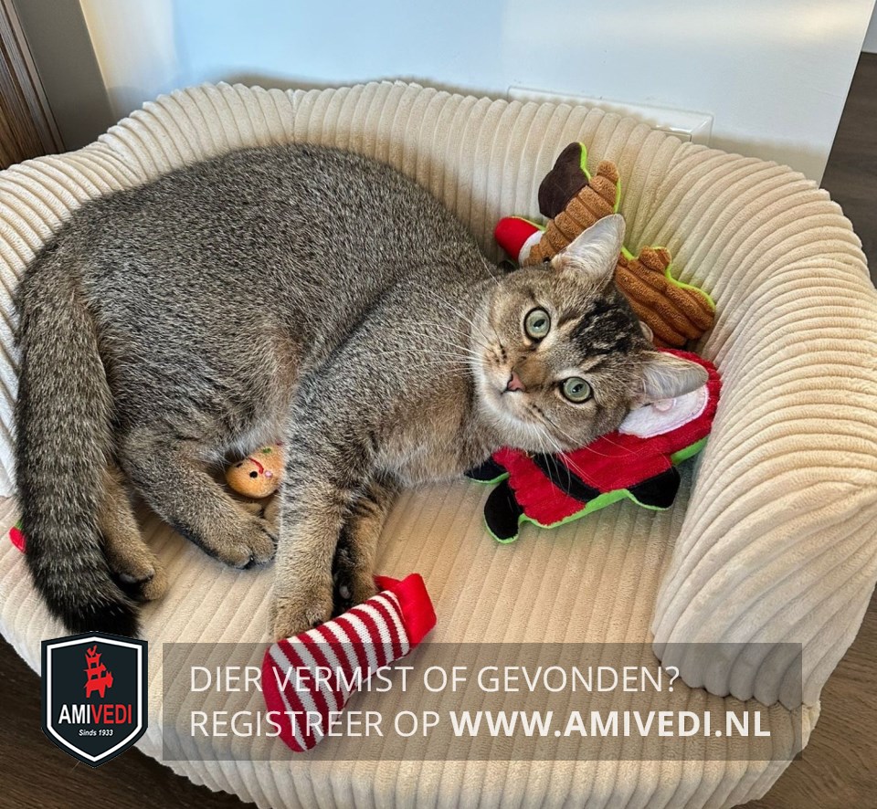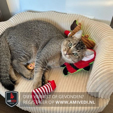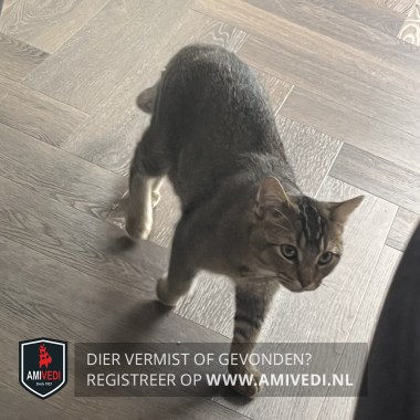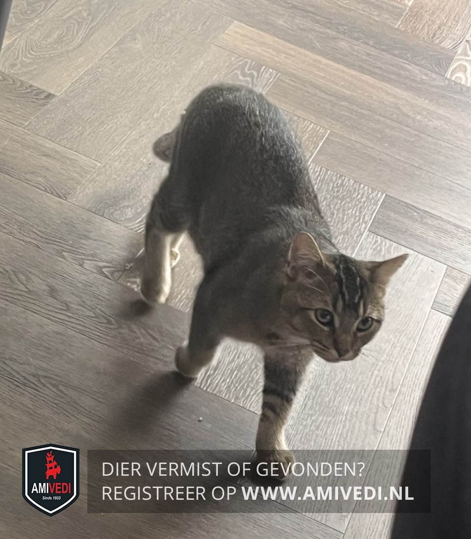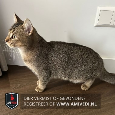 | Signalement | Kruising. Cypers bruin/grijs katertje, bruin neusje, licht randje om de oogjes. Cypers bruin/zwart op het kopje. Wit snorretje en wit op de kaaklijn. Witte hals en beige borst. Wat zwarte streepjes op de linker voorpoot. Beige sokjes. Zwarte streep over zijn rug. |