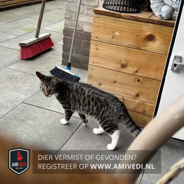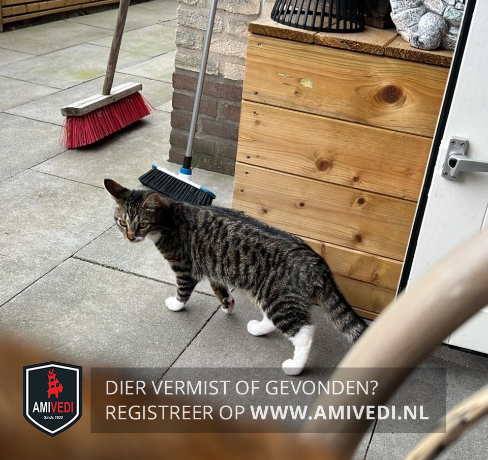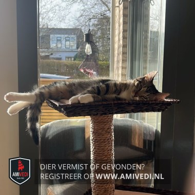 | Signalement | Cypers bruin/grijs/zwart met wit. Cypers bruin/zwarte kop. Vrij grote oren vergeleken met de kop. Links van de neus een wit vlekje. Witte kin en bef. Cypers bruin/zwarte rug, zijflanken, buik en staart. Beide voorpoter cypers bruin/zwart met witte voetjes. Beide achterpoten cypers bruin/zwart met witte kousjes. Ze is net gesteriliseerd. |