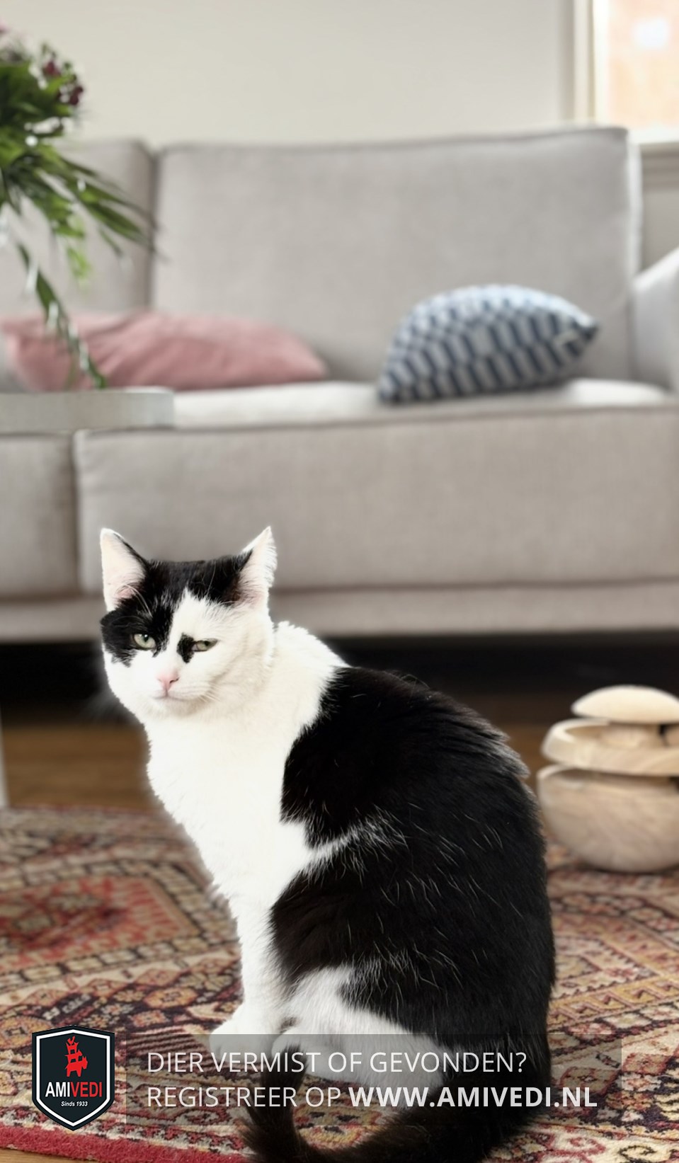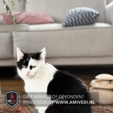| Signalement | Witte oren, zwart boven op de kop wat doorgaat over het rechter oog, zwart vlekje in de hoek van het linker oog, witte snuit, kraag, bef, borst, buik, alle poten, zwart dekje op de rug en in het midden gaat het naar de flanken, begin van de staart een witte ring, staart is zwart. |