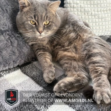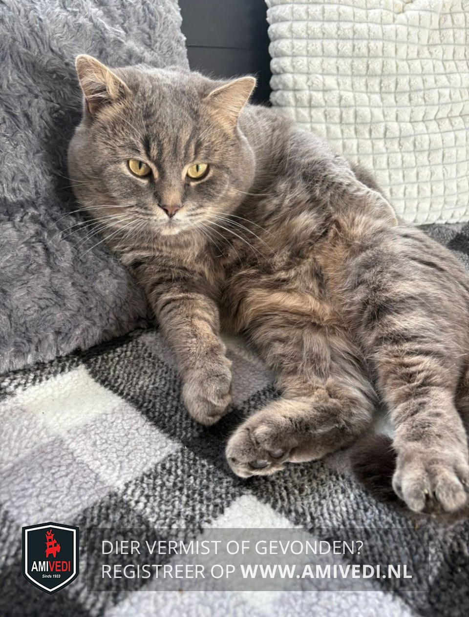 | Signalement | Cypers grijs gestreepte kater met wit mondje, gele ogen, hij heeft een lichtbruine gloed op de vacht, vnl in en onder de oren, op het neusje, op de wangen, buik en poten, zwarte kussentje en donker grijs op de achterkant van de poten |