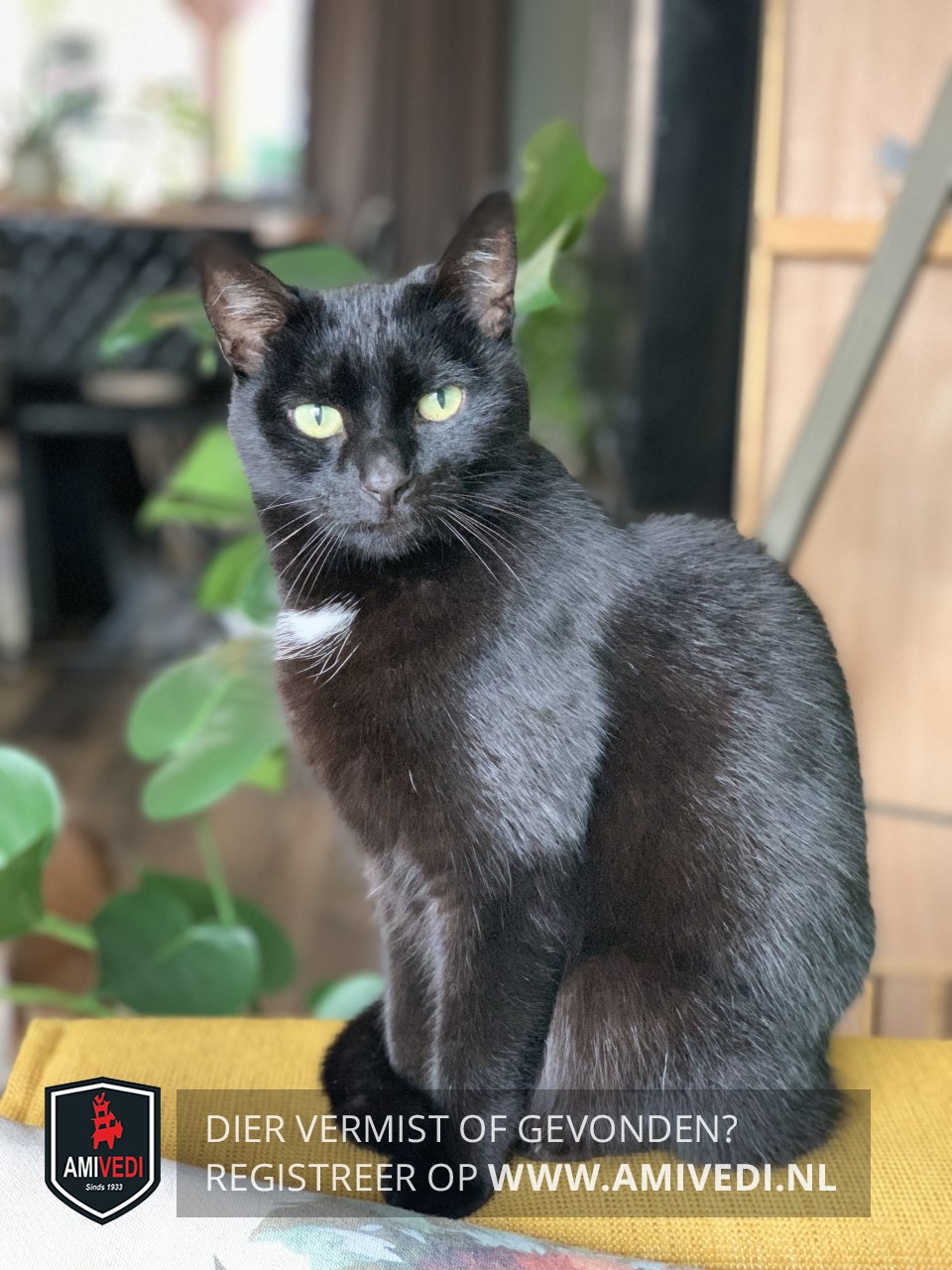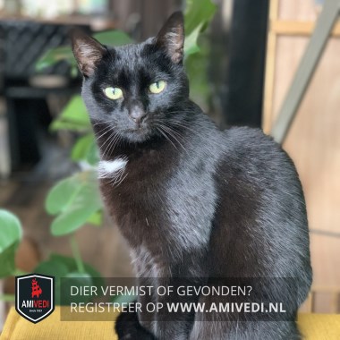 | Signalement | Geheel zwart met groene ogen en een klein wit plukje op de bef. |