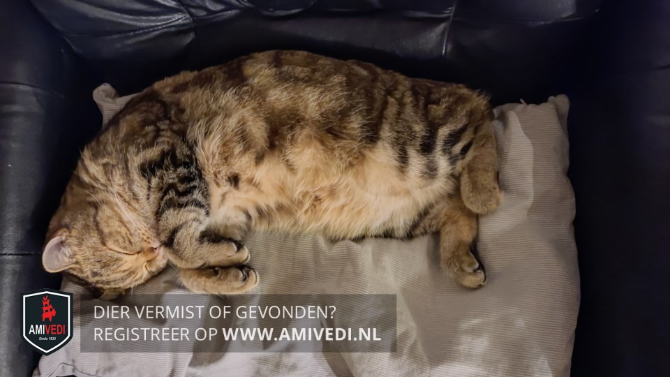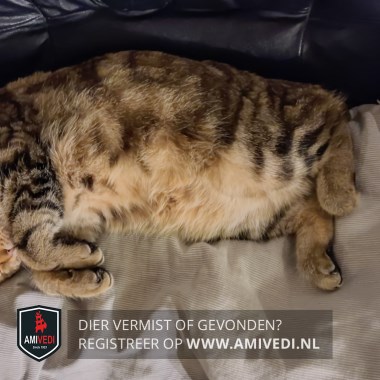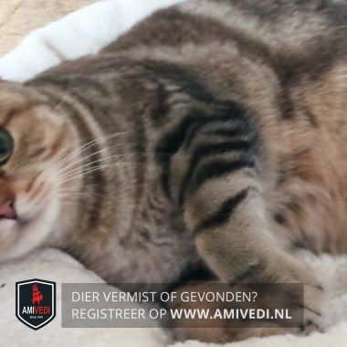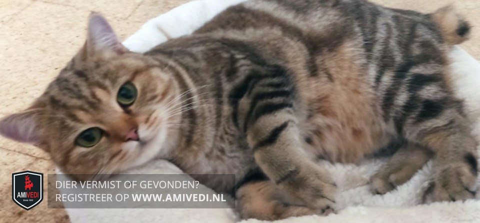 | Signalement | Brits korthaar X Cypers bruin/zwart gestreept met wit en beige, kop cypers bruin met zwart gestreept, bruin neusje, bovenkant bekje iets wit, witte kin, vacht mooi bruin/zwart gestreept met ook beige, bij buik veel beige, voorpoten bruin/zwart gestreept, achterpoten bovenkant bruin/zwart gestreept, voetjes/tenen bruin, heeft geen staart alleen bolletje |
