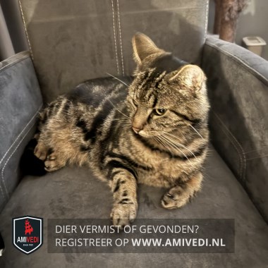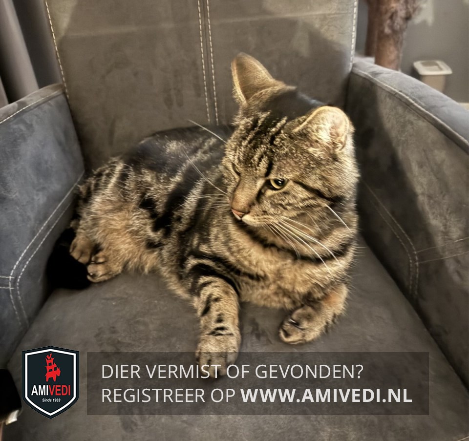 | Signalement | Europese korthaar, bruin met zwart gestreept. Bovenkant kopje zwart, over de rug bruin/zwart gemarmerd. 1 zwarte streep over de borst. |