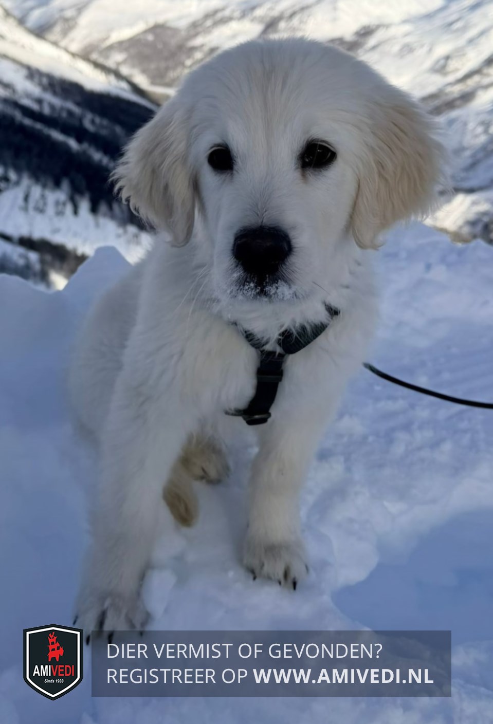| Signalement | Blonde Golden retriever reu, zeer vriendelijk, mist rechts onder de hoektand door tandjes wisselen. |
