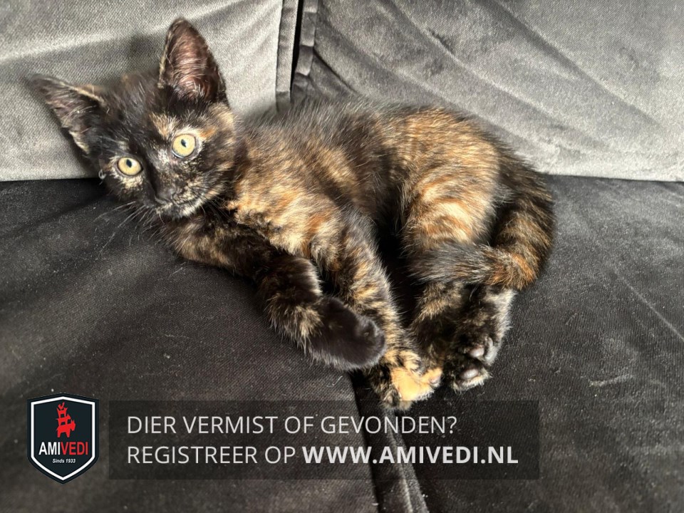 | Signalement | Schildpad poes; zwart met roodbruin beige gemêleerd, grote ogen en is nog jong. |