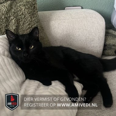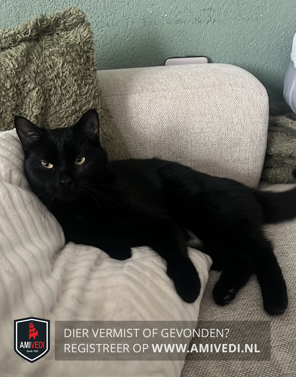 | Signalement | Geheel zwart jong katertje. Gele oogjes. Witte vlek op zijn boven- en onderbuik. Hij lijkt ouder voor zijn leeftijd, je zou hem 4 jaar kunnen schatten. |