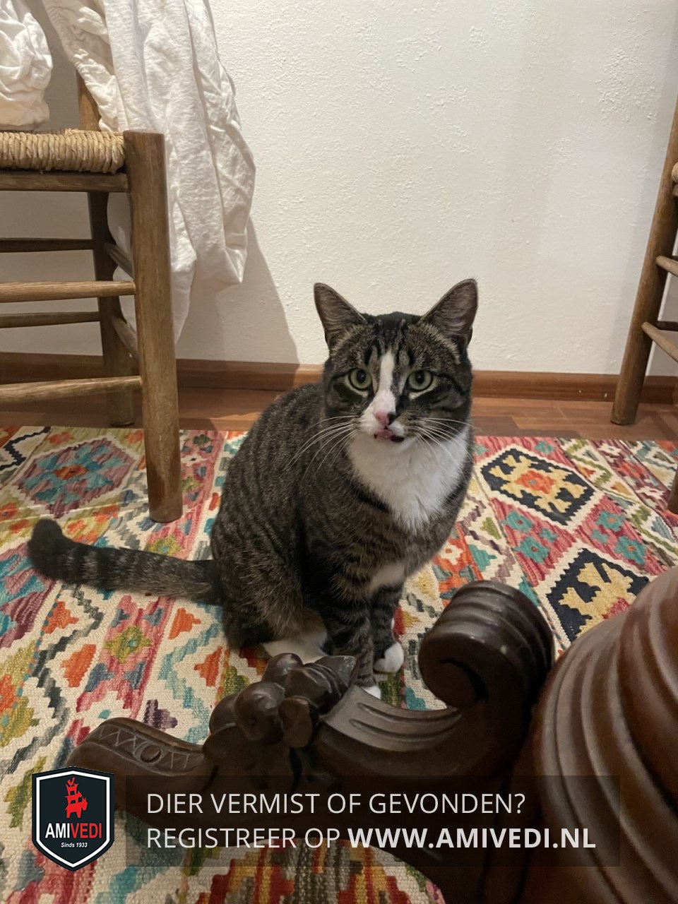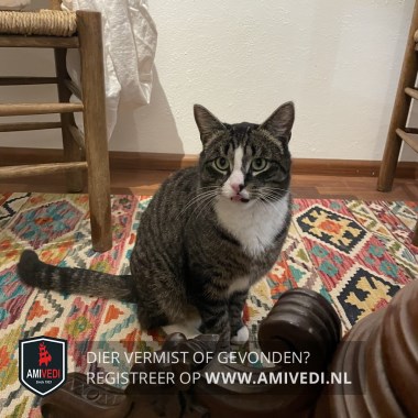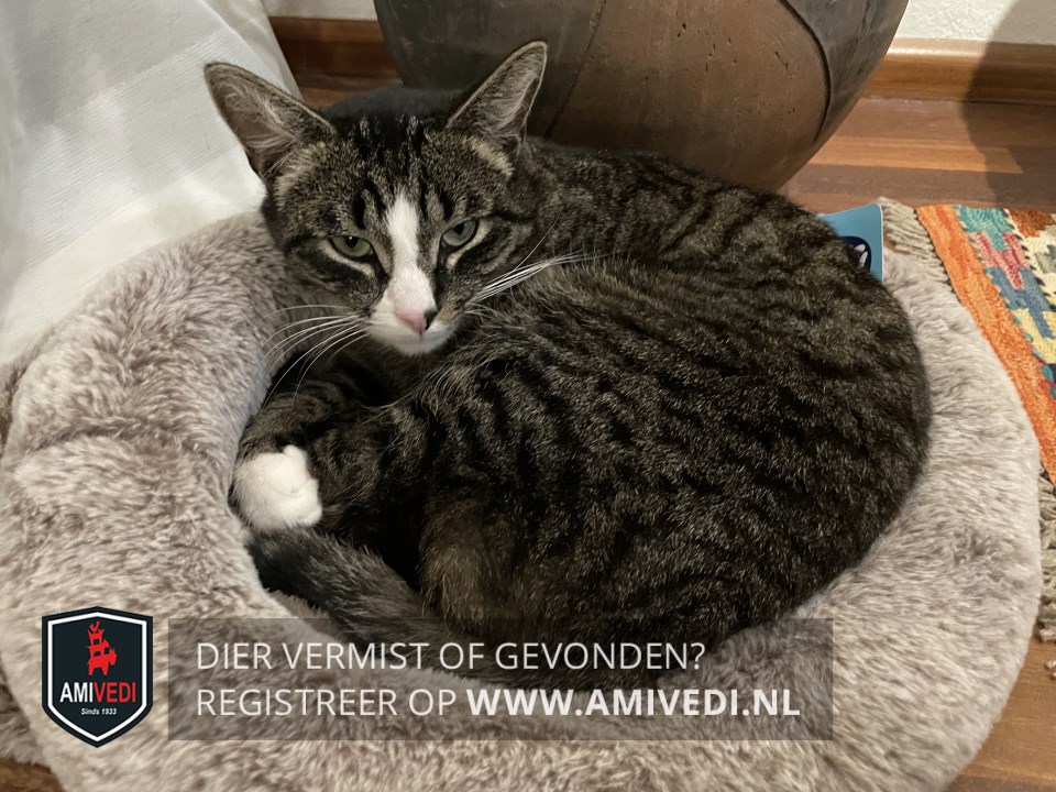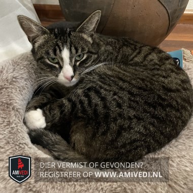 | Signalement | Kater cypersgrijs gestreept met een witte bek en neus, witte voetjes aan de voorpoten en witte sokken aan de achterpoten. |