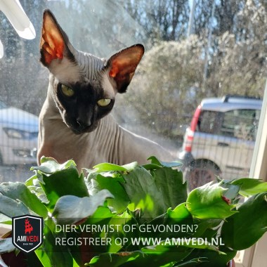 | Signalement | Grotendeels beige van kleur met zwarte accenten: zwart rond de randen van de oren en een zwarte snoet. LET OP: geen buitenkant en recent verhuisd, niet gewend in de omgeving. |