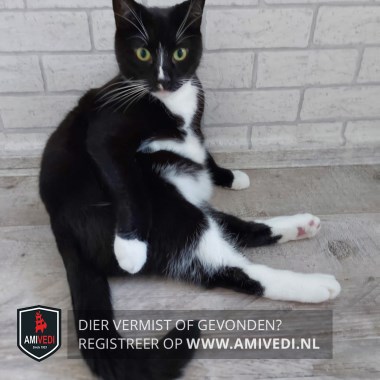 | Signalement | zwarte kat met een witte buik en witte voeten groen grijzige oogen en een smalle witte streep over zijn neus. |