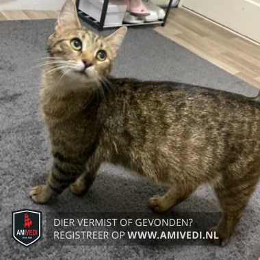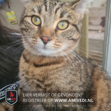 | Signalement | Cypers bruin zwart gestreepte poes met wit aan de bek , witte kin en een cypers bruin zwart gestreept lijfje. |
