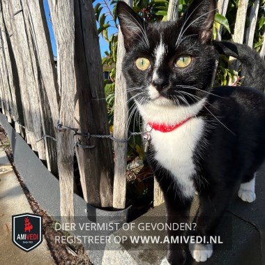 | Signalement | Zwart met witte kat met een kenmerkende witte bles over zijn neus, verder heeft hij een witte kinm een witte hals en borst wat doorloopt naar de buik. Witte teentjes aan de voorpoten en aan de achterpoten witte sokjes. |