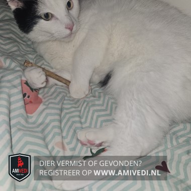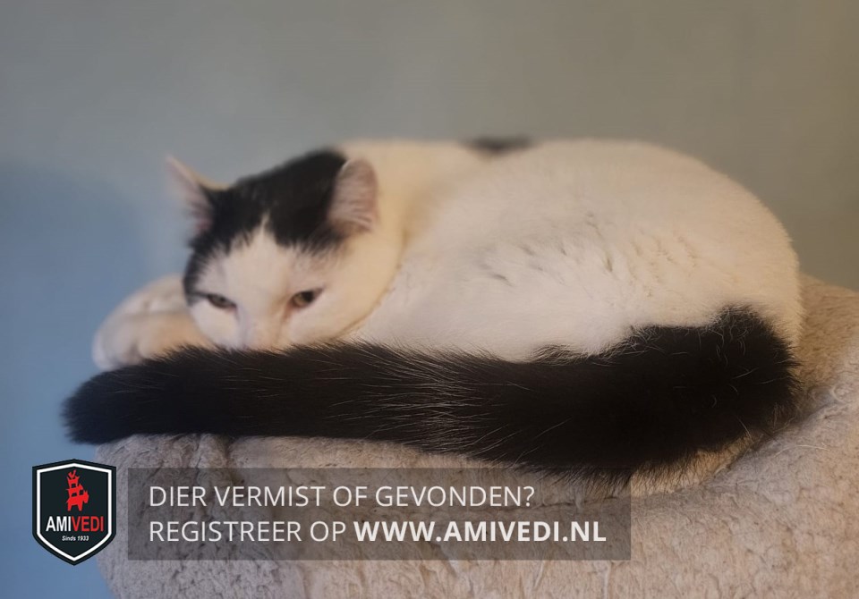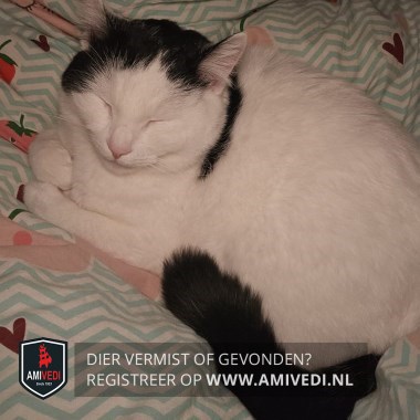 | Signalement | Wit met zwarte accenten: zwart petje, rechts tot naast het oog, zwarte baan op linkerschouder. Zwart vlekje op de buik, zwarte staart. Rest helemaal wit. |