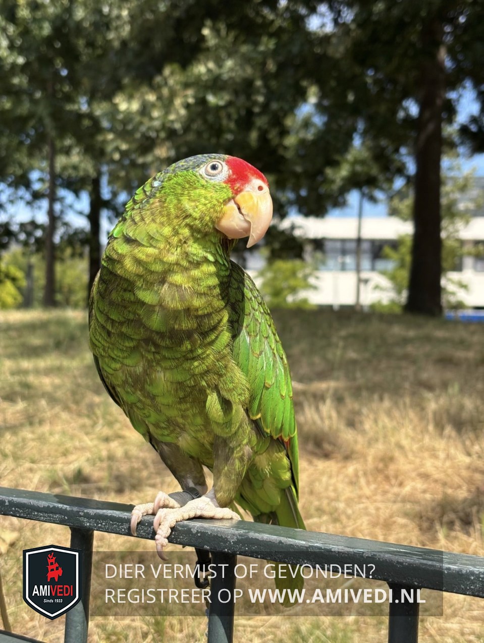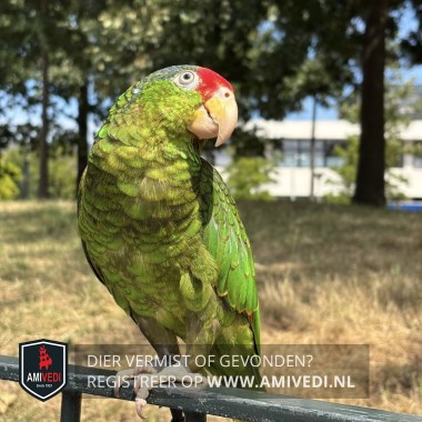 | Signalement | Amazonepapegaai; hoofdzakelijk groen met rood boven de neus |