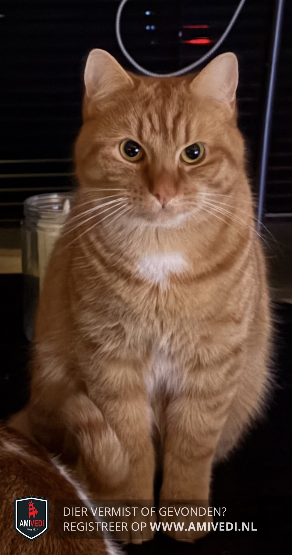| Signalement | Klein, ronde kop, zwart vlekjes bij linker kussentje achterpoot. uiteinde staart is wit. witte onderkin. |