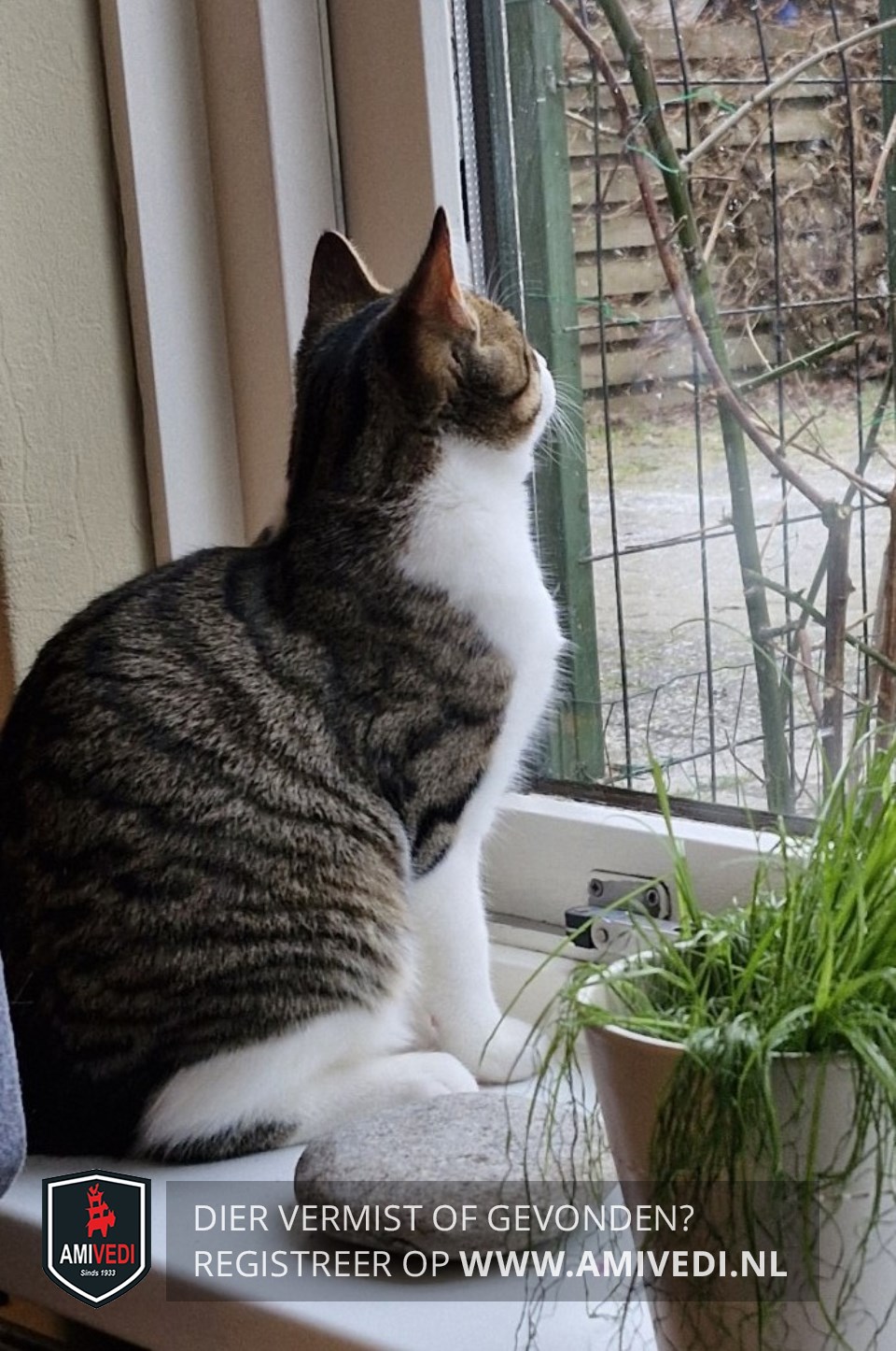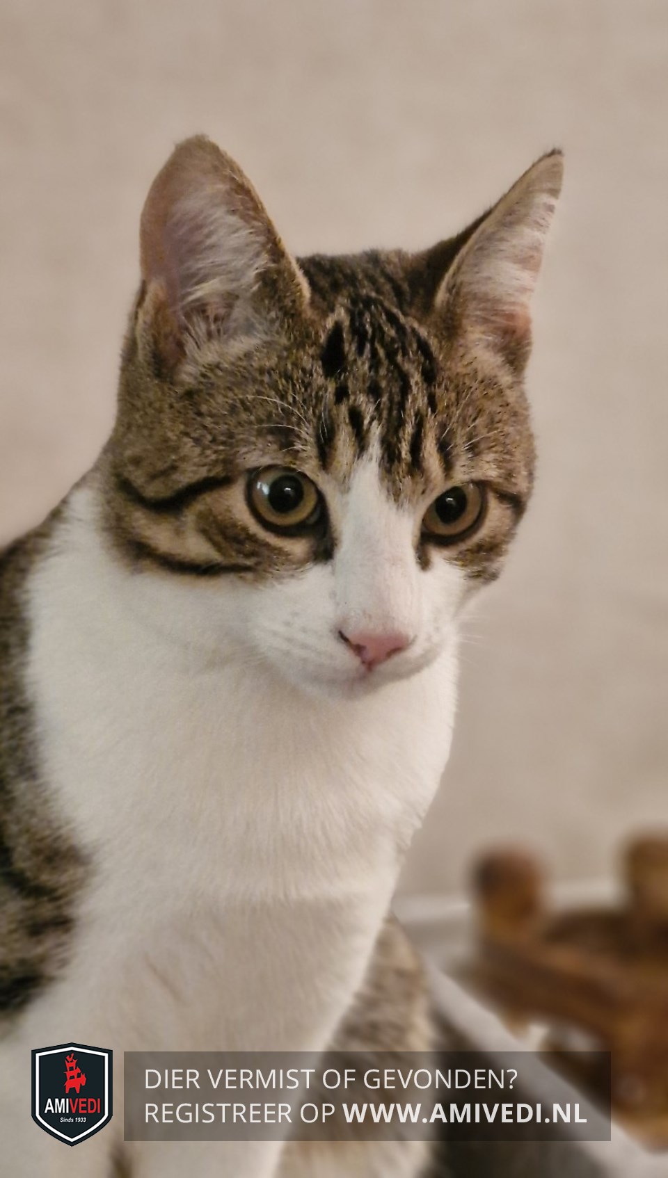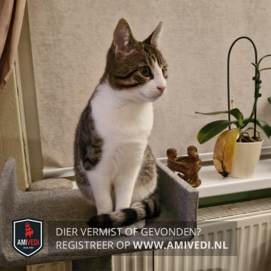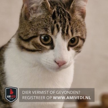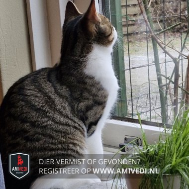 | Signalement | Cypers bruin-grijs/zwart met wit. Cypers bruin/zwart bovenop de kop, oren, nek, rug, zijflanken en staart. Cypers bruin/zwarte voorhoofd tot onder beide ogen en zijkanten kop. Brede witte strook tussen de ogen, rondom neus en bek. Witte kin, bef, borst en buik. Witte poten, bij rechter achterpoot aan achterzijde bij de hak cypers bruin/zwart. Recent gecastreerd. |