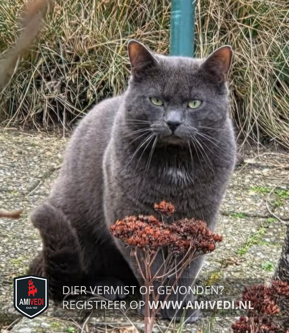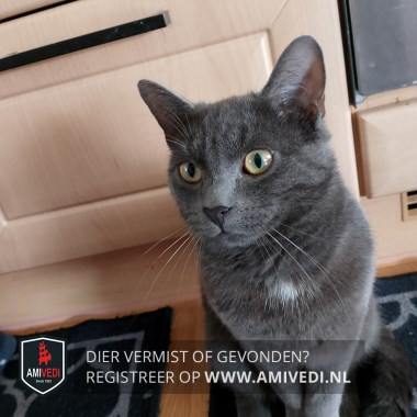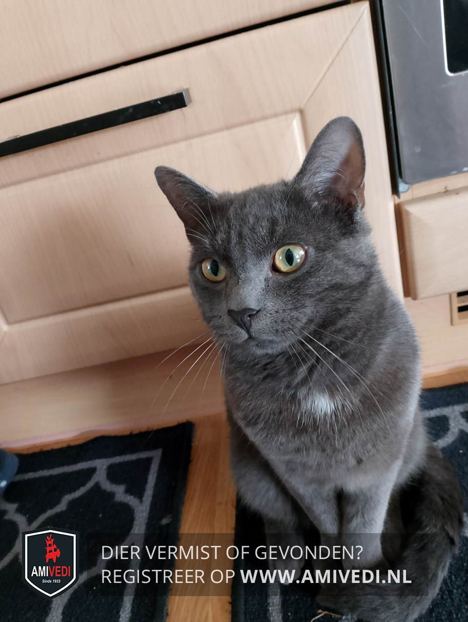 | Signalement | Blauwgrijs met een zwart neusje, een kleine witte vlek op de bef en is erg vriendelijk. |