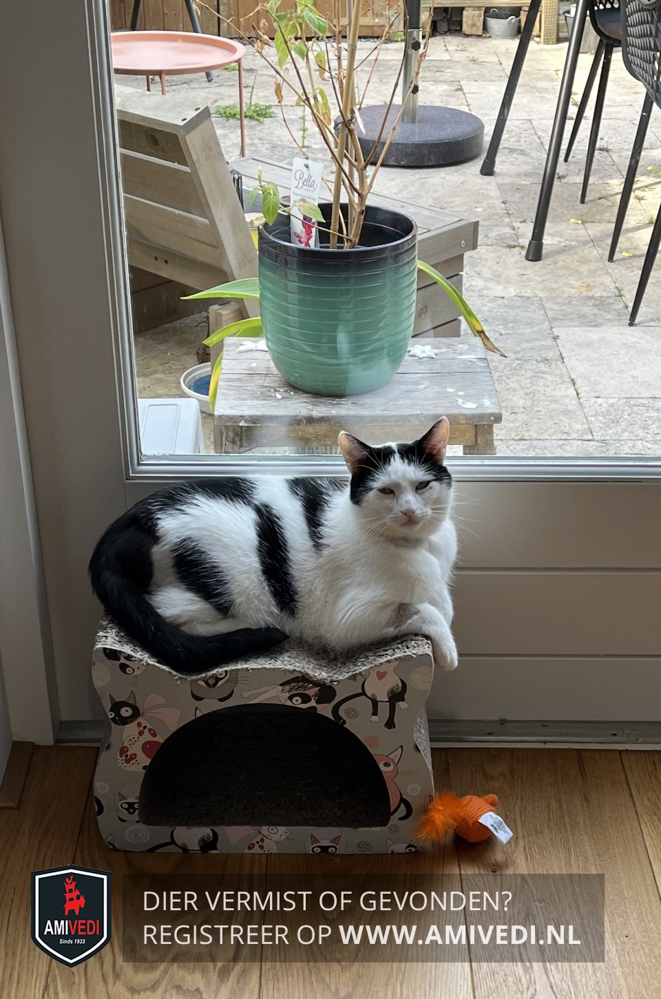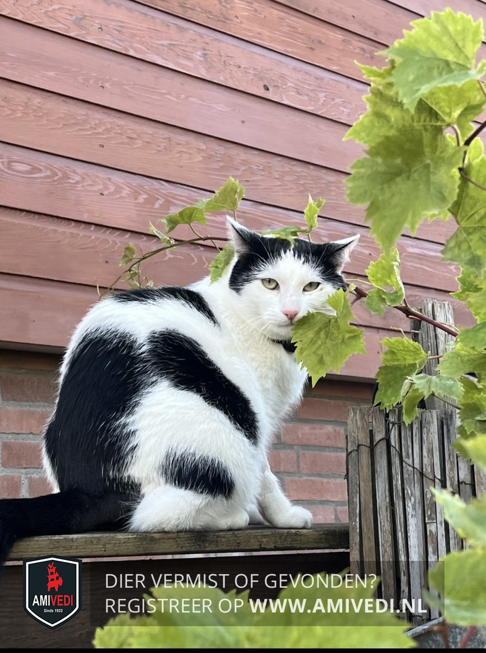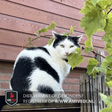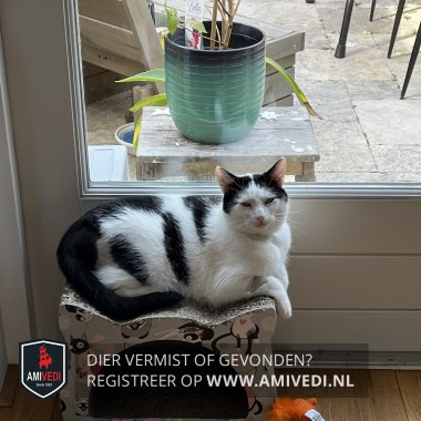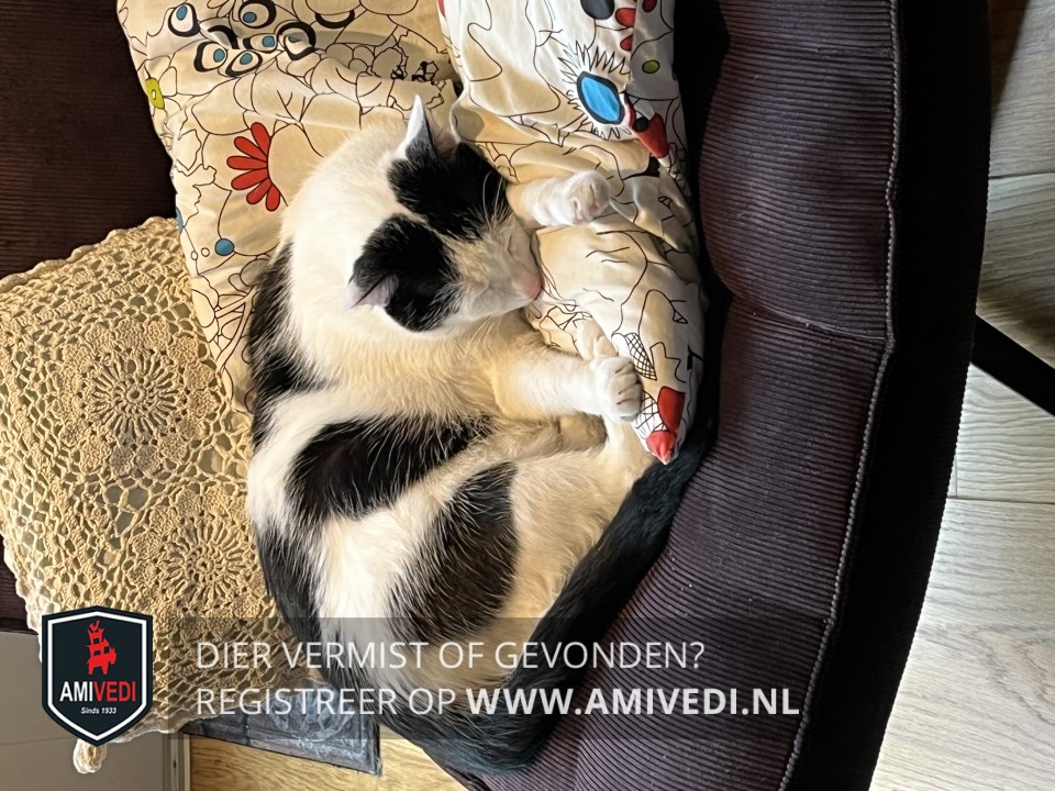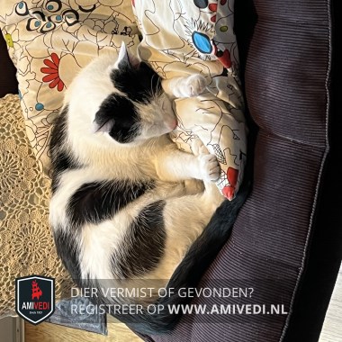 | Signalement | Wit met zwarte kater, rondom oren zwart, klein wit streepje in het midden bovenop kop, wit rondom ogen, witte neusbrug, wit bekje, witte bef en borst, grote koe achtige zwarte vlekken over zijn lijf, zwarte staart. Heeft dieetvoeding nodig |