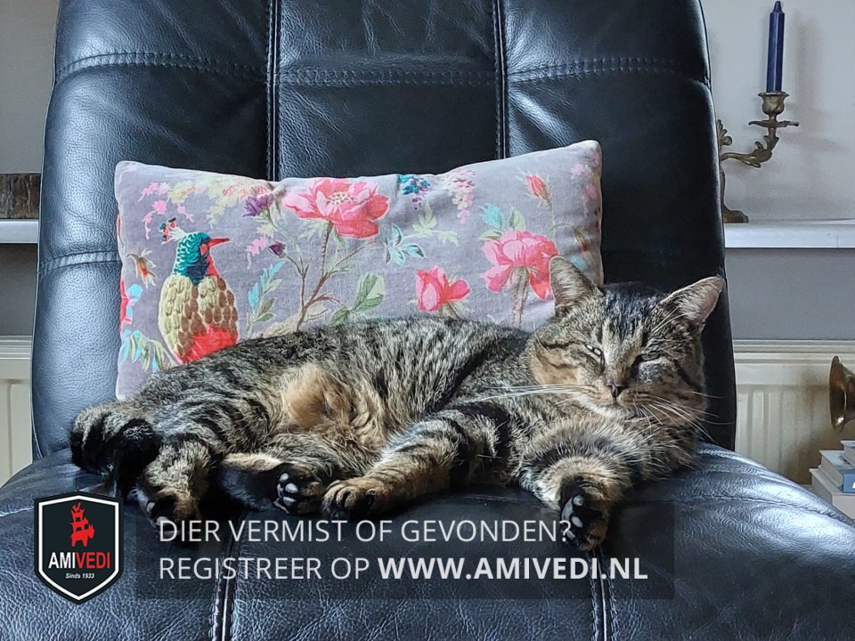 | Signalement | Grote Kater. Zwart met grijze strepen en een bruine tint er doorheen als hij in de zon loopt en met een witte kin. |