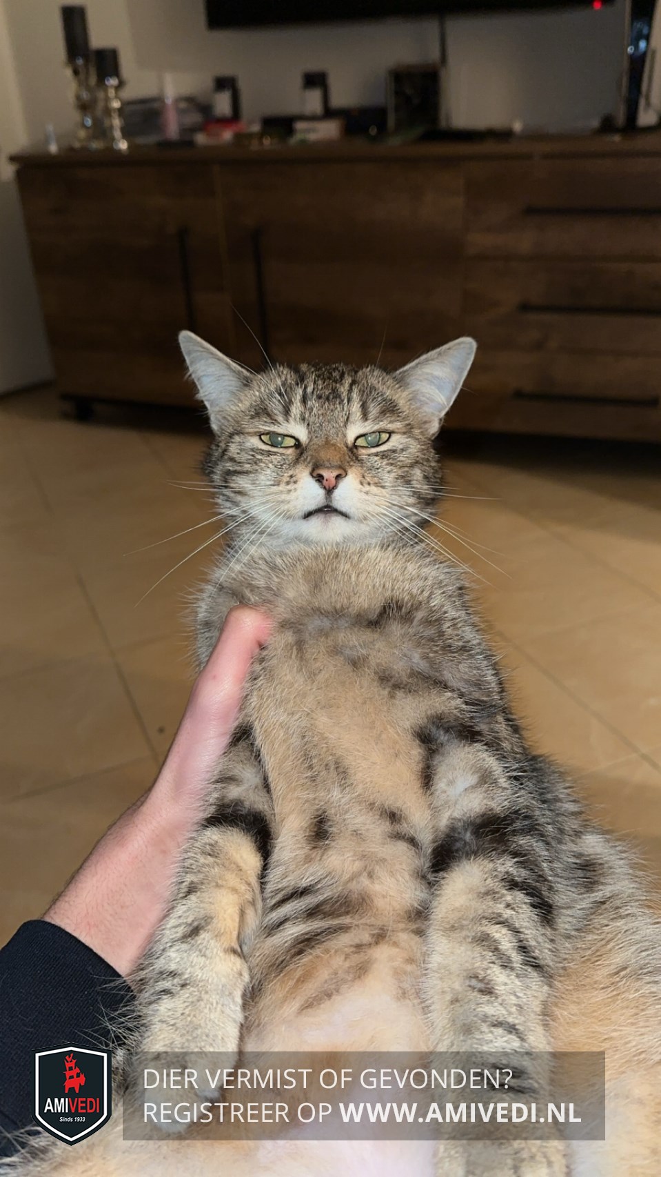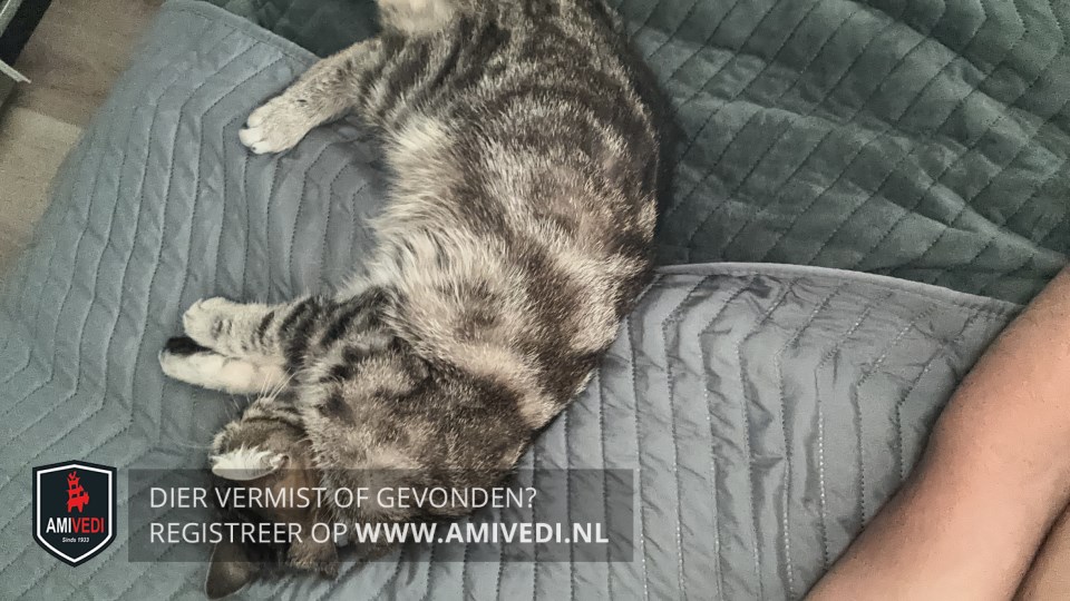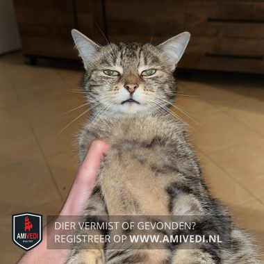 | Signalement | Europese korthaar, bruin/grijs met zwart gemarmerd en wit. Bovenlippen en kin wit. Borst en buikje bruin. |