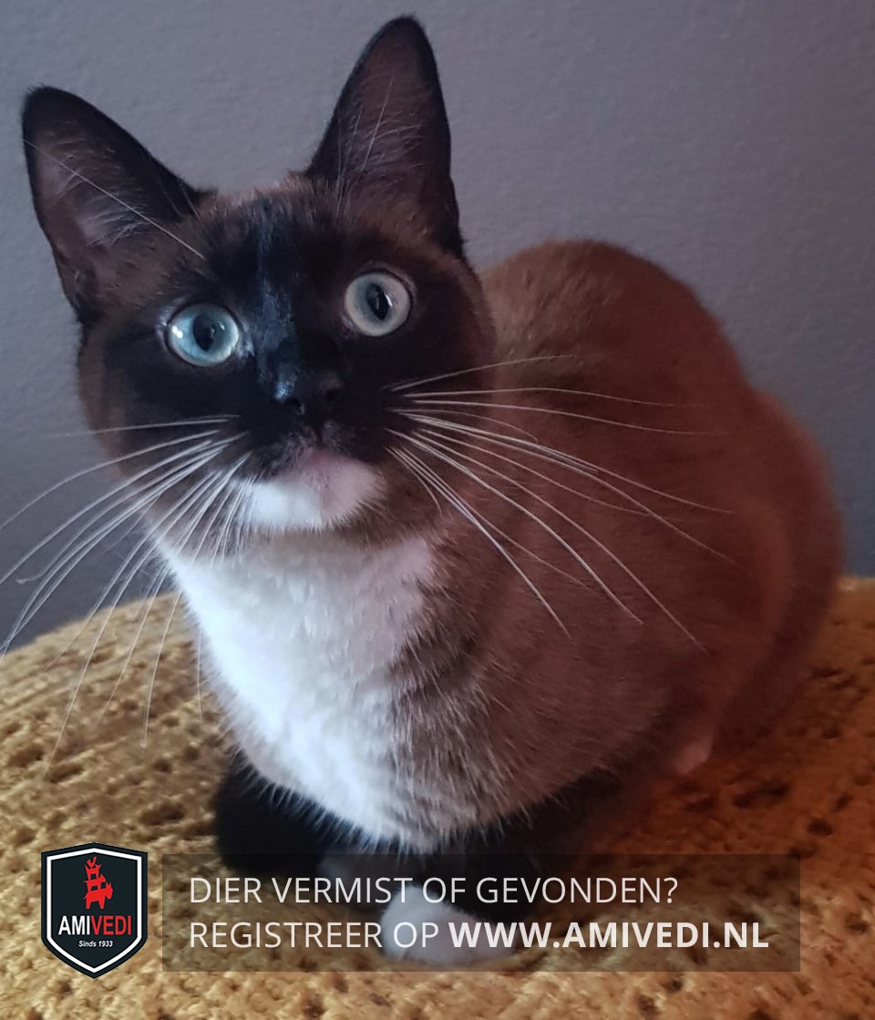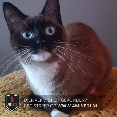 | Signalement | Zwart snoetje, witte bef. Beige/rood lijf, zwarte voetjes Chip geregistreerd op naam van M. Aarts |