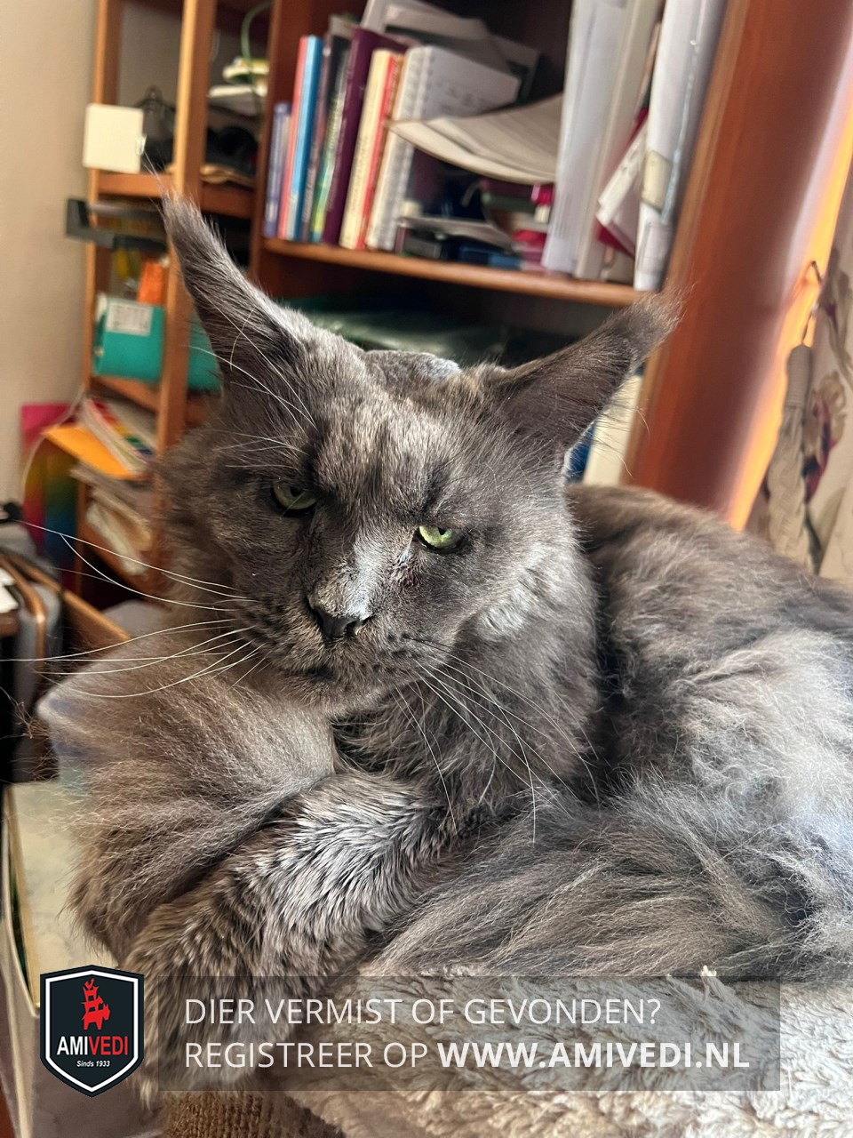 | Signalement | Maine Coon-kater, in grijs met lichte cyperse tekening op de kop. Langharig, op de buik wat klitten in de vacht. |