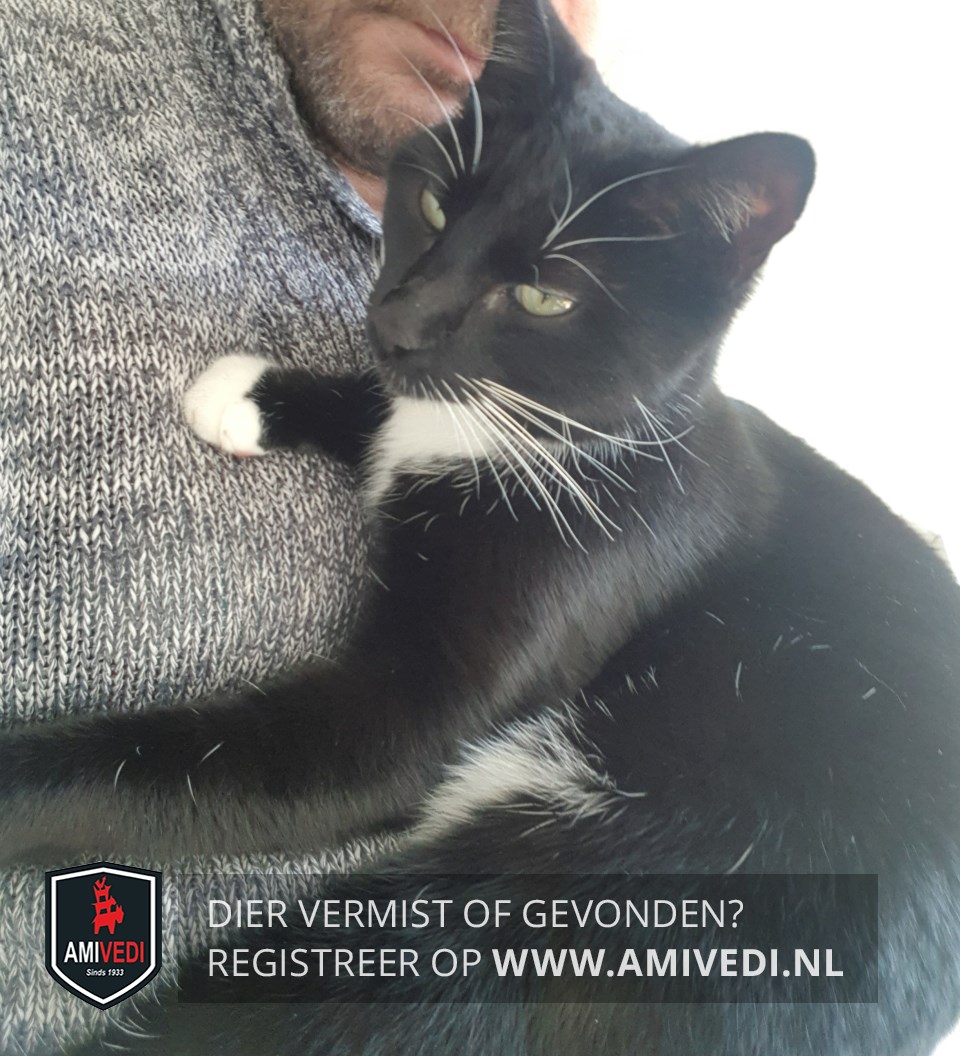 | Signalement | Zwart met witte snorharen, witte bef, witte streep over de buik, witte voetjes, witte haren verspreid over het lijf. |