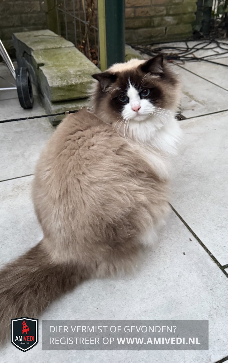 | Signalement | Kop; donkerbruin over de oren tot onder de ogen, witte bles lopend over de neus naar de wangen, kin wit. Borst wit. Voorpoten wit. Rug beige. Staart donkerbruin. |
