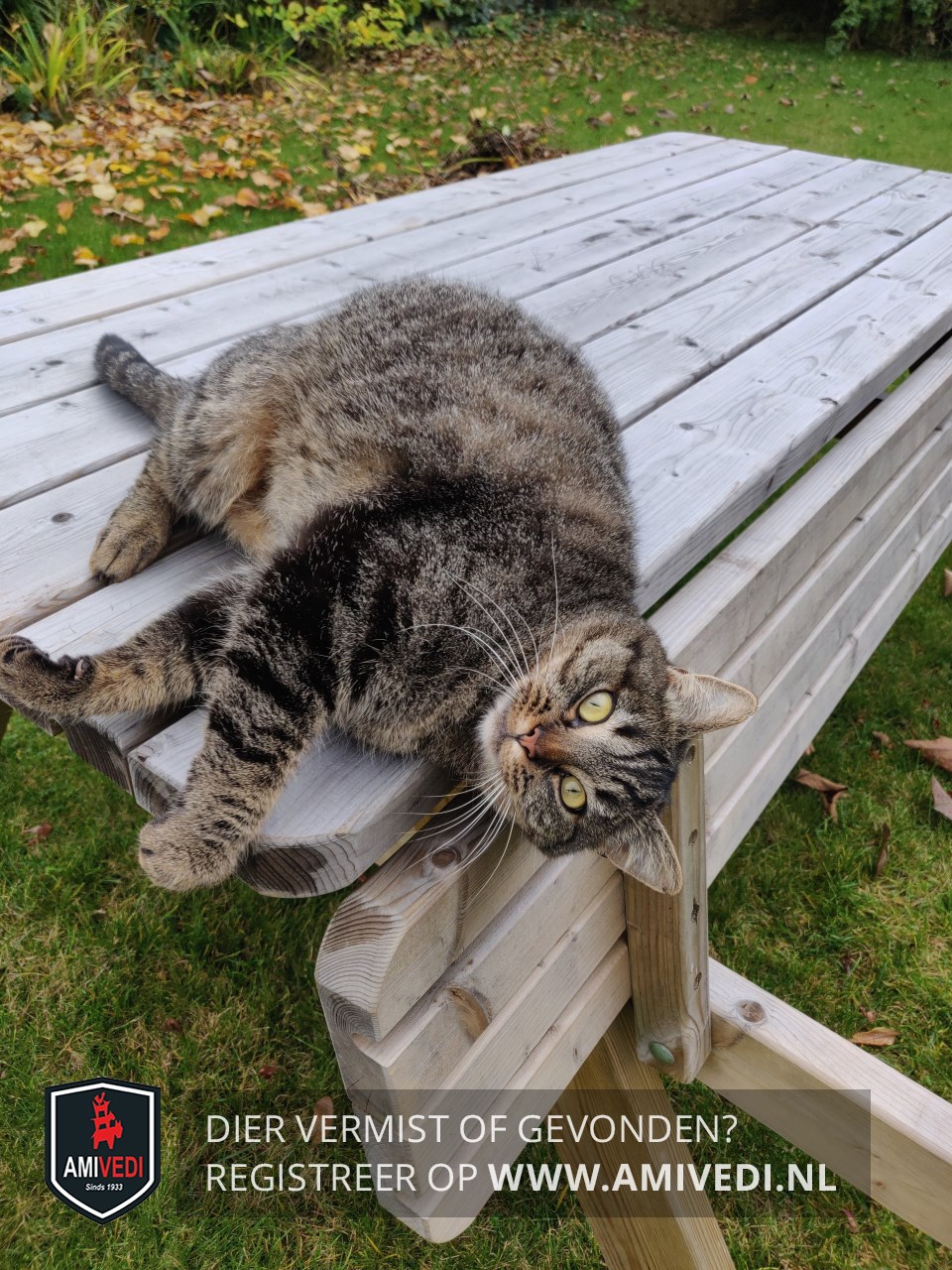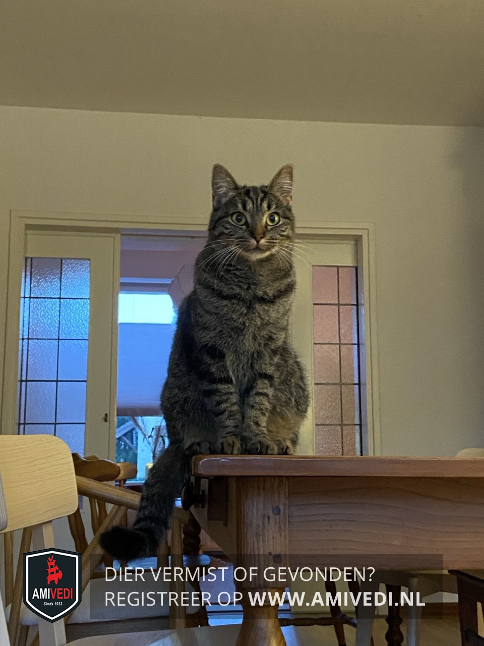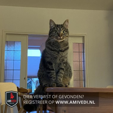 | Signalement | Grijs/zwart gestreept met wat bruin, klein wit snorretje en witte kin. |