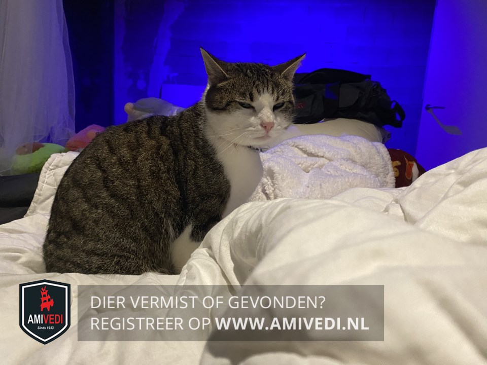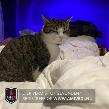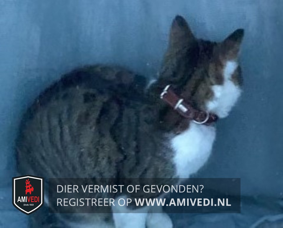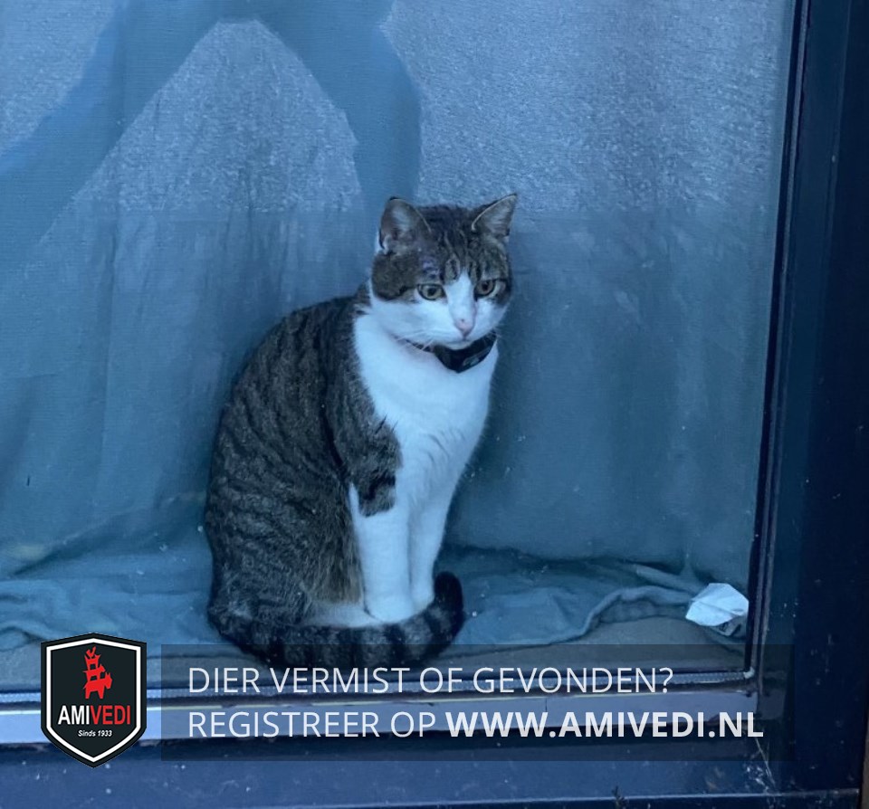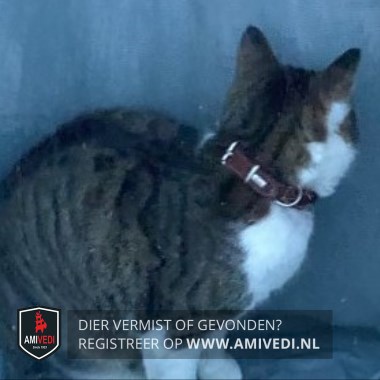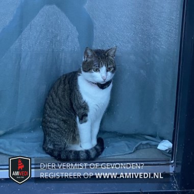 | Signalement | Cypers kopje. Witte bles. Wit snuitje, hals en borst. Grijs lijf. Witte pootjes.Geringde staart. Finke kater. Beetje schrikachtig. Vermoedelijk gestresst tijdens verhuizing. |
