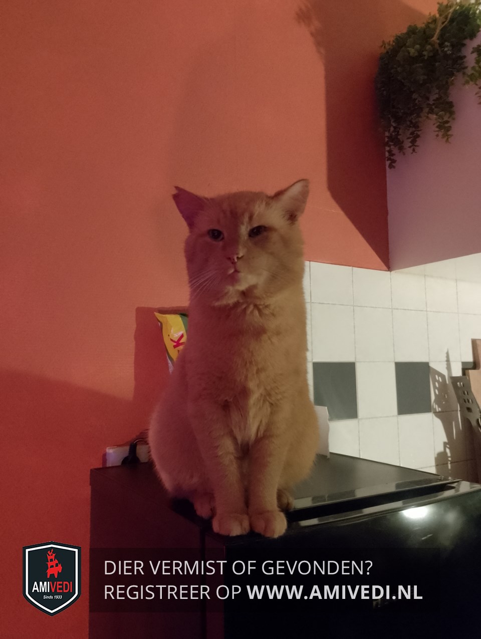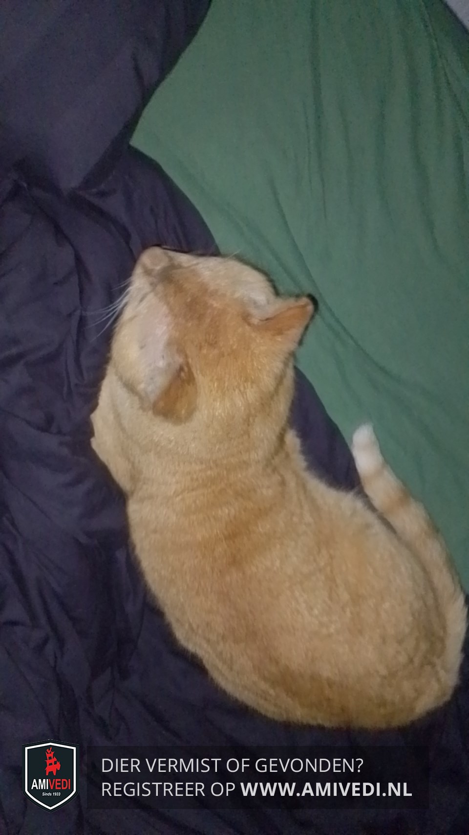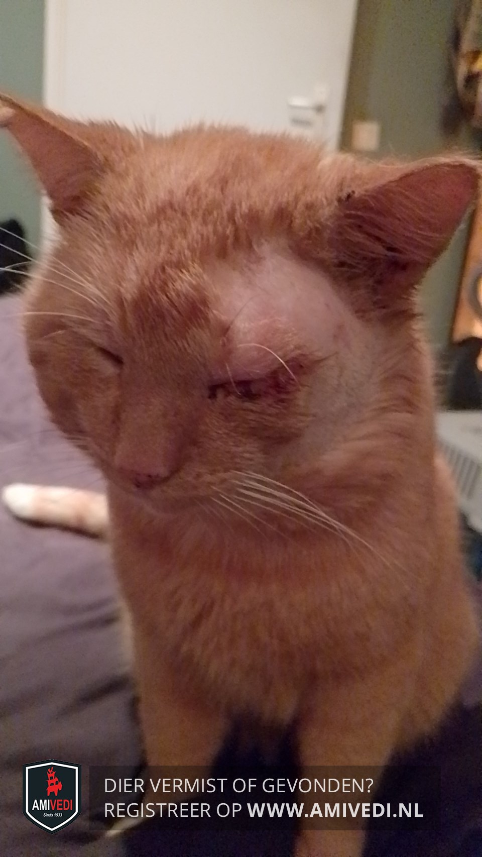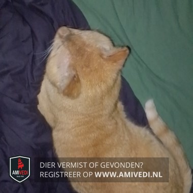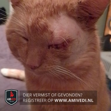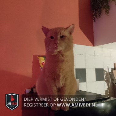 | Signalement | Cypers rood/oranje gestreept met wit. Kort geleden linkerkant kop geschoren door dierenarts voor behandeling oog. Heeft een sneetje in rechter oor Punt van de staart is wit |