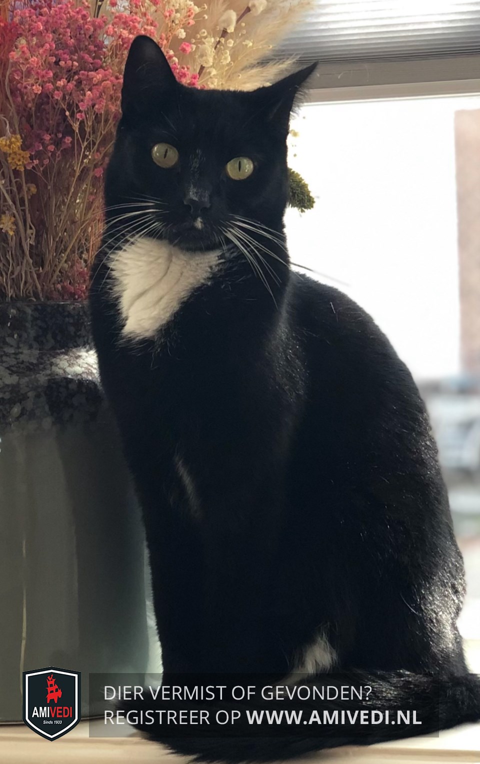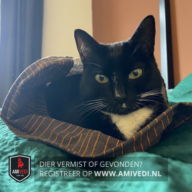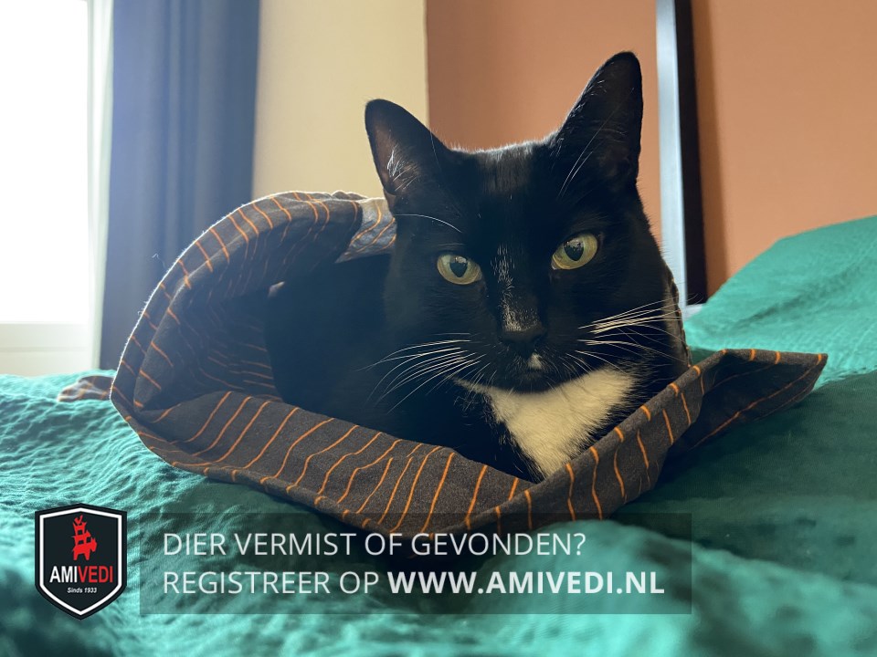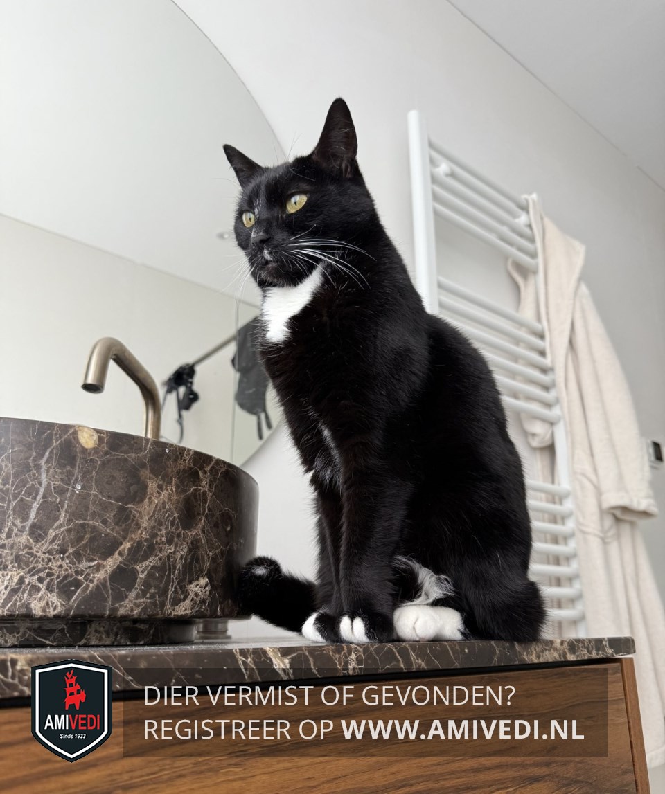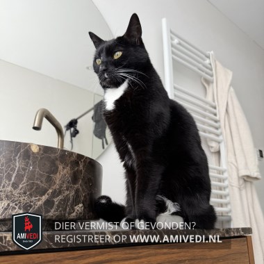 | Signalement | Overwegend zwart met duidelijke witte accenten: dun wit streepje over de neusbrug, klein wit plekje links onder de neus, witte snorharen, witte bef, enkele witte teentjes aan de voorpoten, witte sokjes aan de achterpoten en een heel klein wit stipje op de staart. Borst en buik zijn ook wit. |