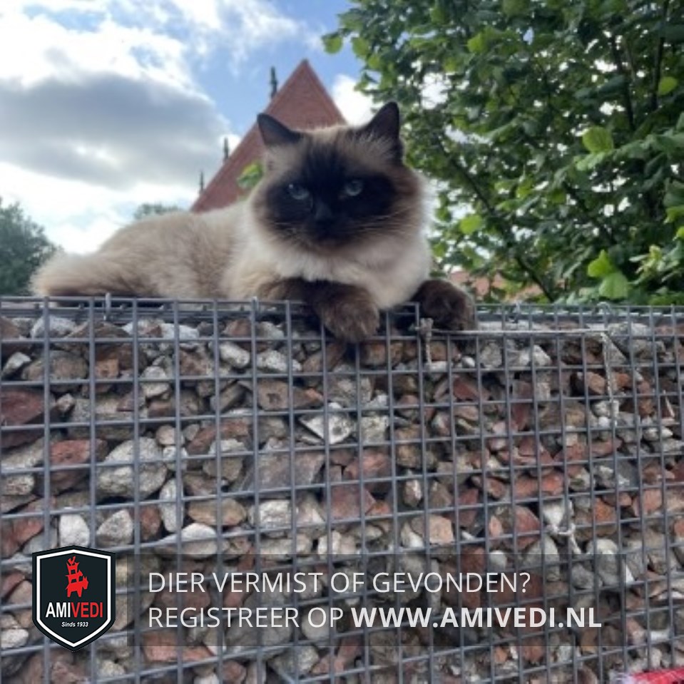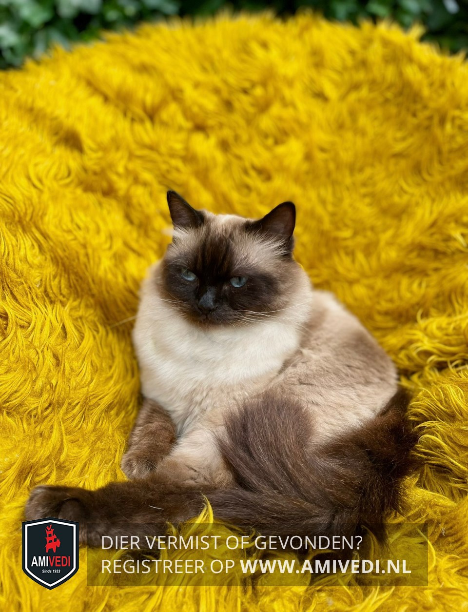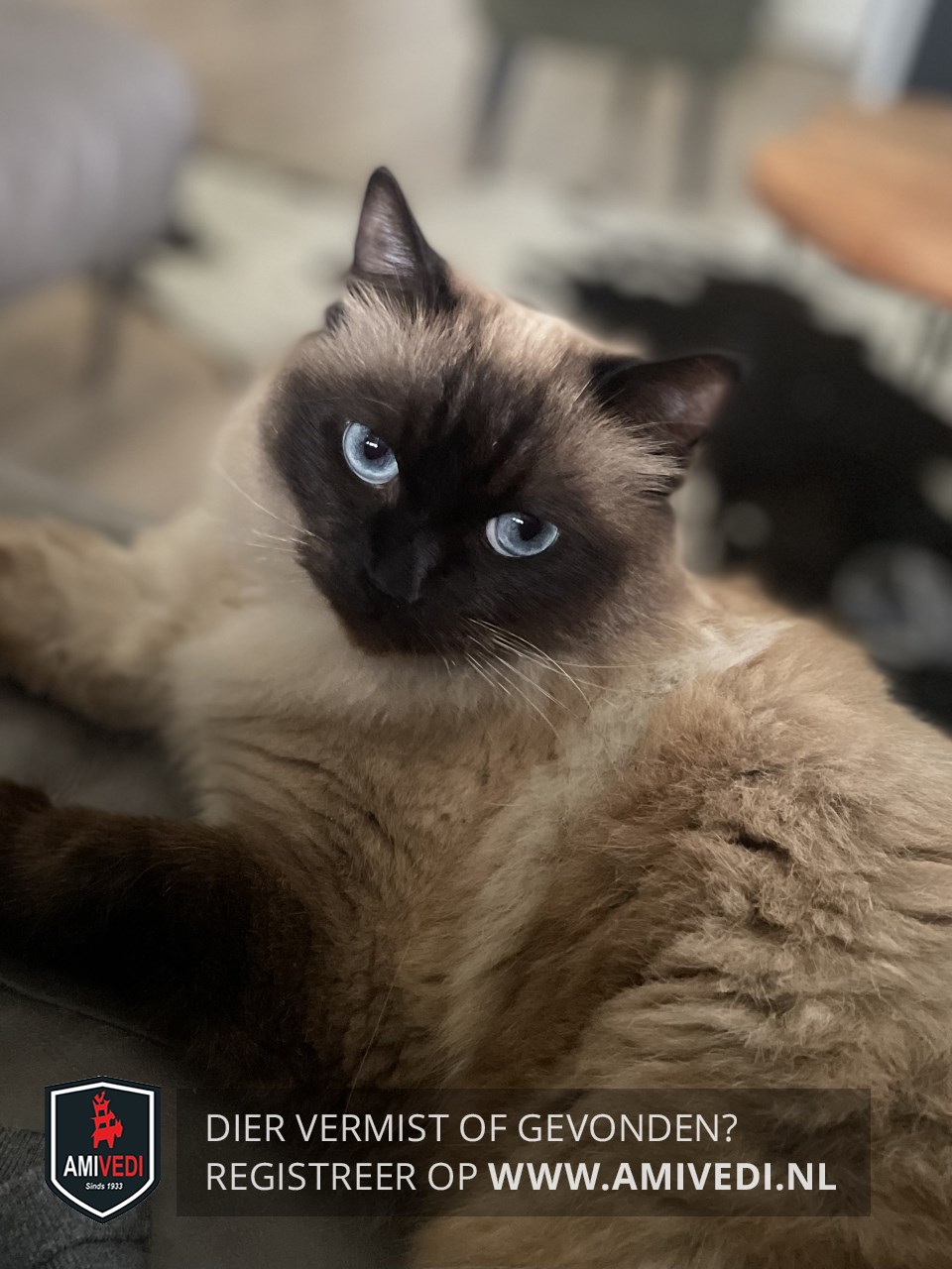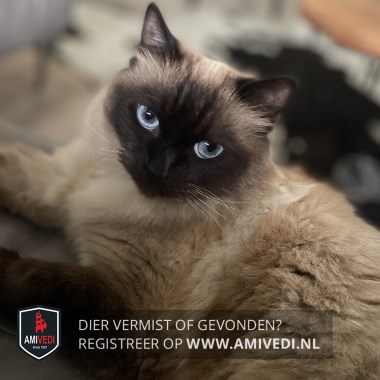 | Signalement | Het is een Ragdoll sealpoint met blauwe ogen. Beige met bruin en wit. Donker bruin masker en oren. Witte brede bef. Bruine poten. Lijfje is beige met wat licht bruin er doorheen. |