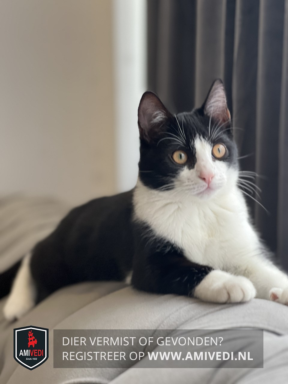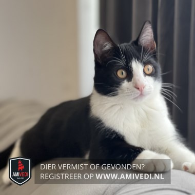 | Signalement | Zwart met wit, witte neusbrug, wit bekje, wityte bef en borst, zwarte rug en flanken, linker voorpoot wit, rechtervoorpoot wit voetje, rechter achterpoot met wit |