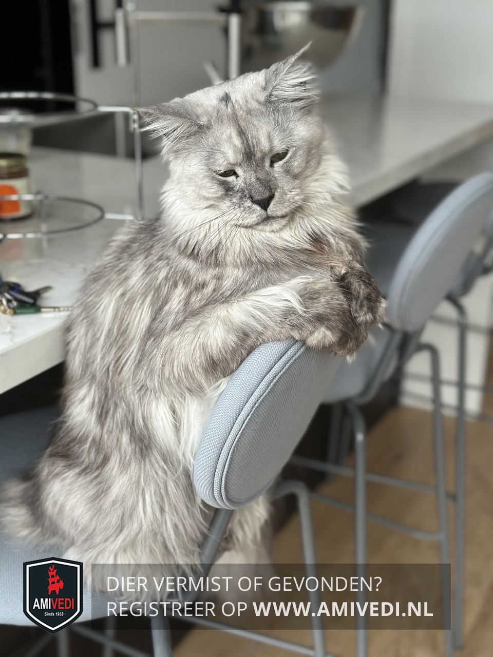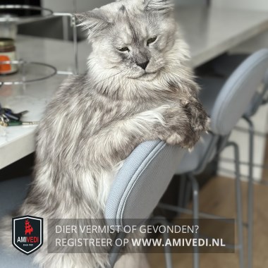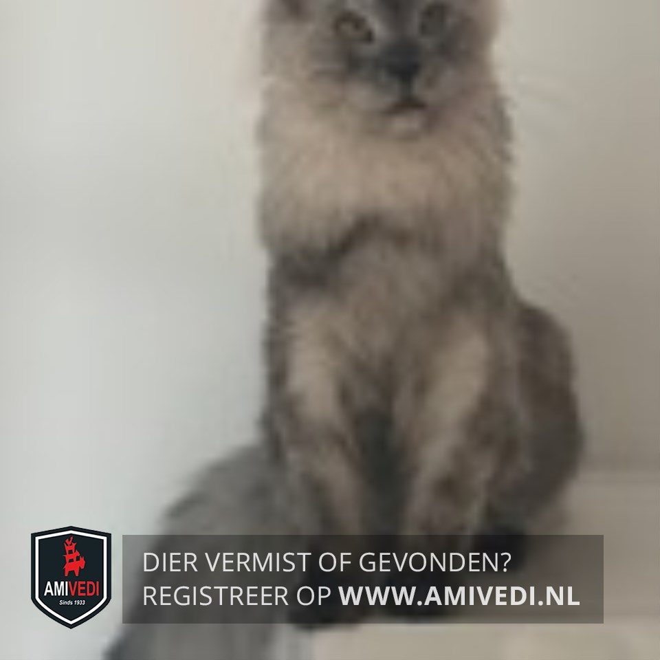 | Signalement | Grijs neusje, wit petje, grijze oortjes, witte kraag. Pootjes hebben grijze voetjes. Verder grijs-wit gemêleerd. |
