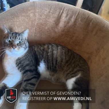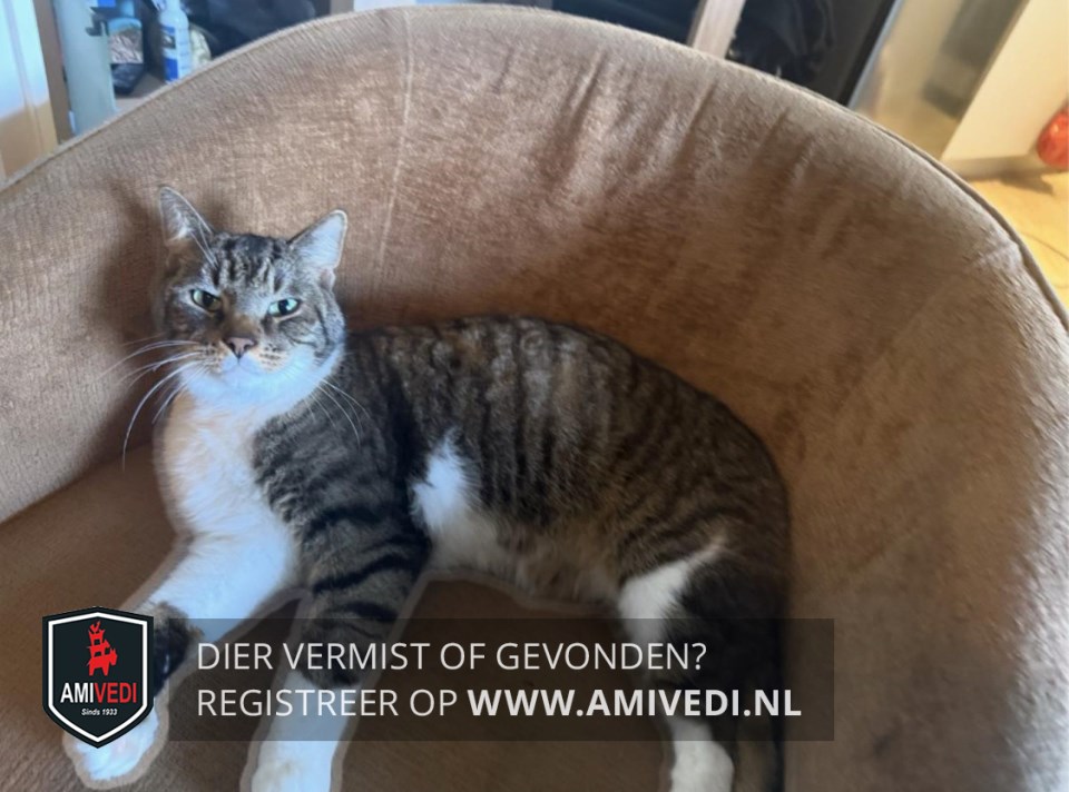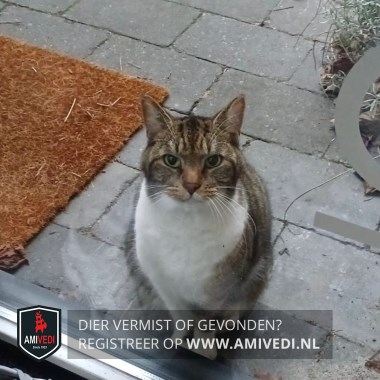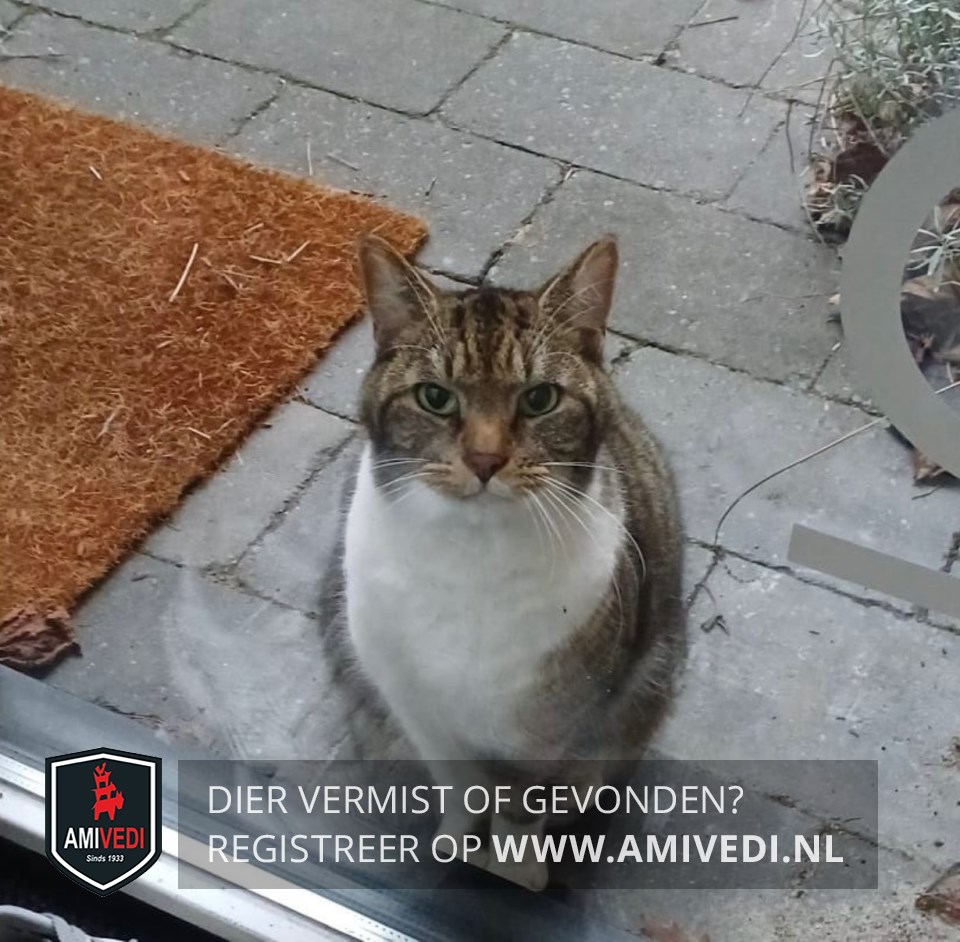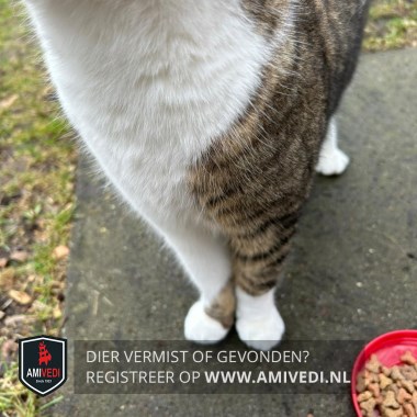 | Signalement | Cypers bruin/zwart met wit. Cypers bovenop de kop, oren, voorhoofd, rondom de ogen, neusbrug en zijkanten kop. Wit onder de neusgaten en mond, witte kin, beft, borst en buik. Cyperse nek, rug, zijflanken en staart. Rechter voorpoot wit, bij de voet aan de zijkant en achterzijde een cypers bruin/zwarte vlek. Linker voorpoot cypers bruin/zwart met wit voetje. Beide achterpoten cypers bruin/zwart met witte kousen. |
