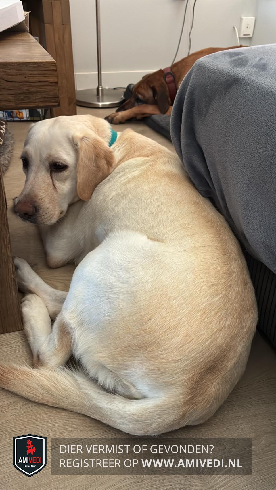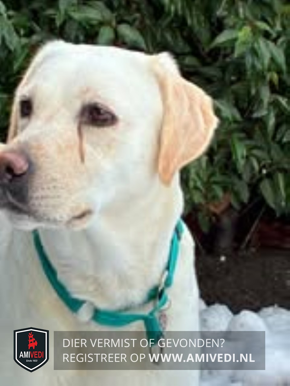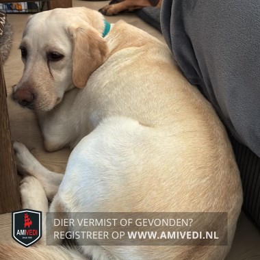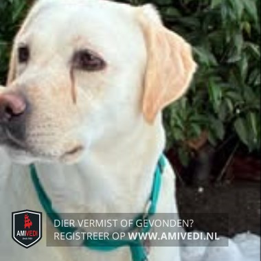 | Signalement | Beige/blonde labrodor, met wat lijkt een zwarte lijn onder linkeroog. Ten tijde van de vermissing droeg ze een mintgroene halsband met grijs/rode 8 meter flexlijn. |