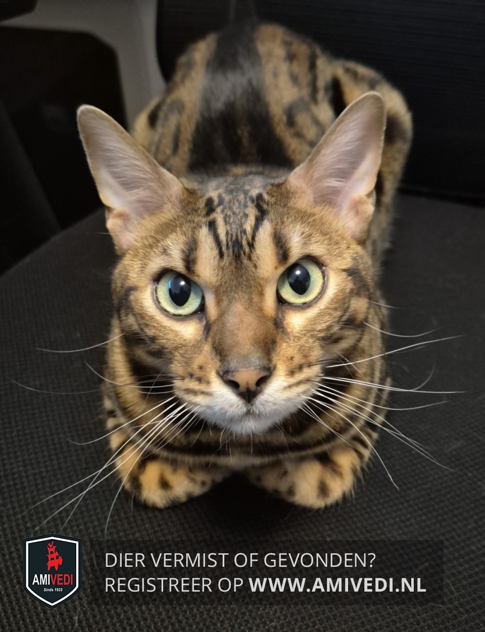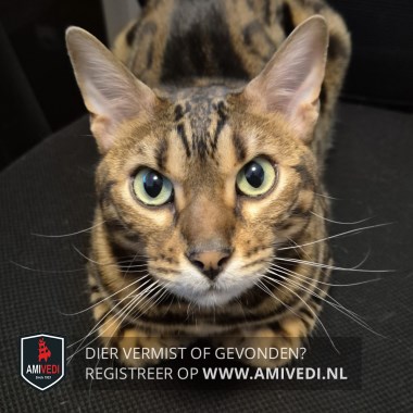 | Signalement | Bengaal kater, bruin-zwart met rozetten (zwarte cirkels op de flanken) en duidelijke zwarte lijnen. Zeer vriendelijk. |