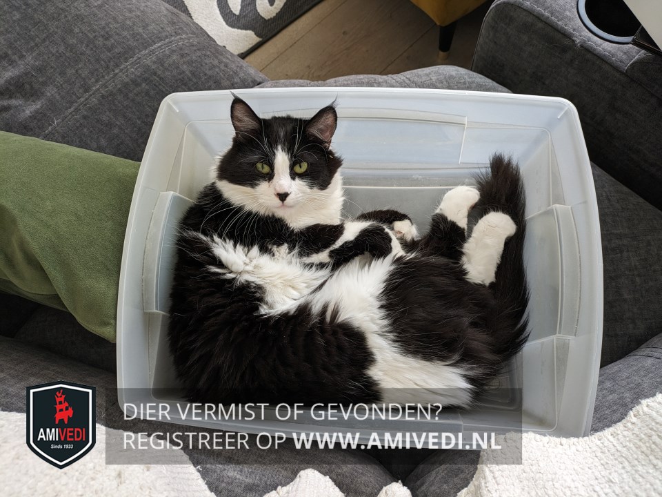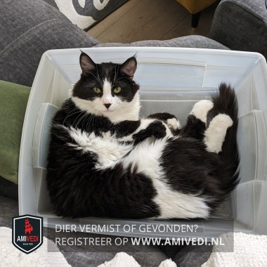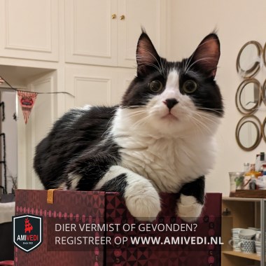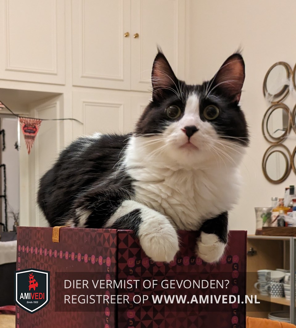 | Signalement | Zwart-witte kat met halflange vacht, lange pluimpjes aan de oren. Zwart bovenop het kopje tot rond de ogen, zwart neusje in een verder witte snoet, witte hals, bef, borst en buik. Wit voetje aan de linkervoorpoot, witte laars aan de rechtervoorpoot met een deels zwart vlak; rug en flanken grotendeels zwart. Dikke zwarte pluimstaart |