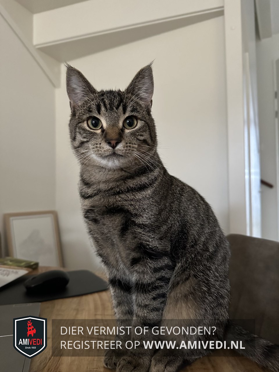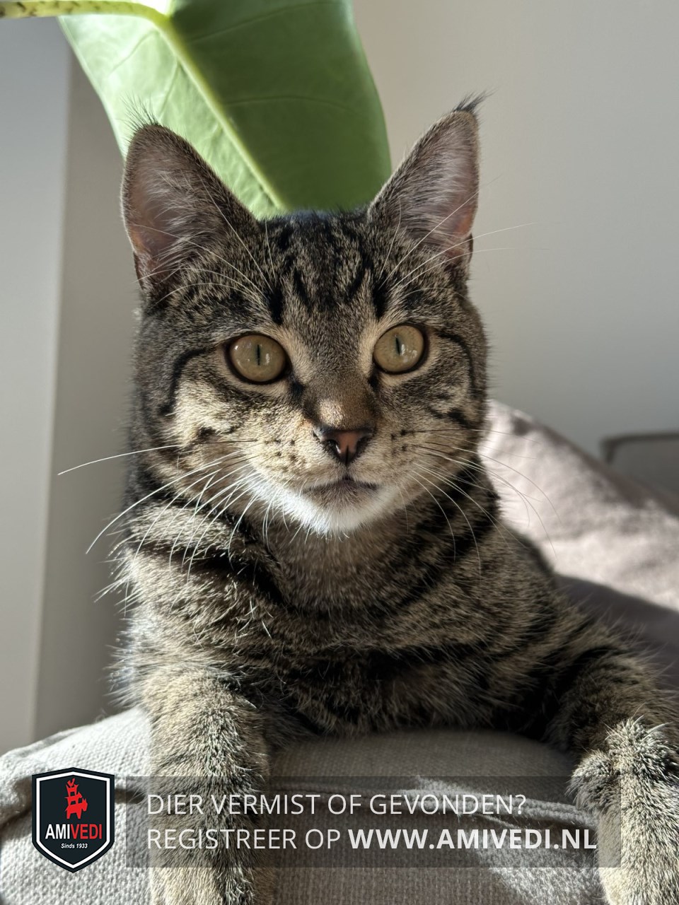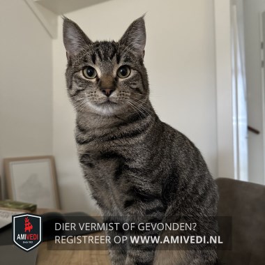 | Signalement | Volledig cypers bruin/zwart. Licht grijze kin. Op beide oren op de puntjes plukjes haar. |