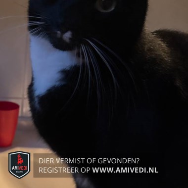 | Signalement | Zwart koppie met witte vlekjes onder de neus. Witte kin, bef. Beide voorpoten witte sokjes. Linker achterpootje witte teentjes. Rechter achterpoot wit kousje. |