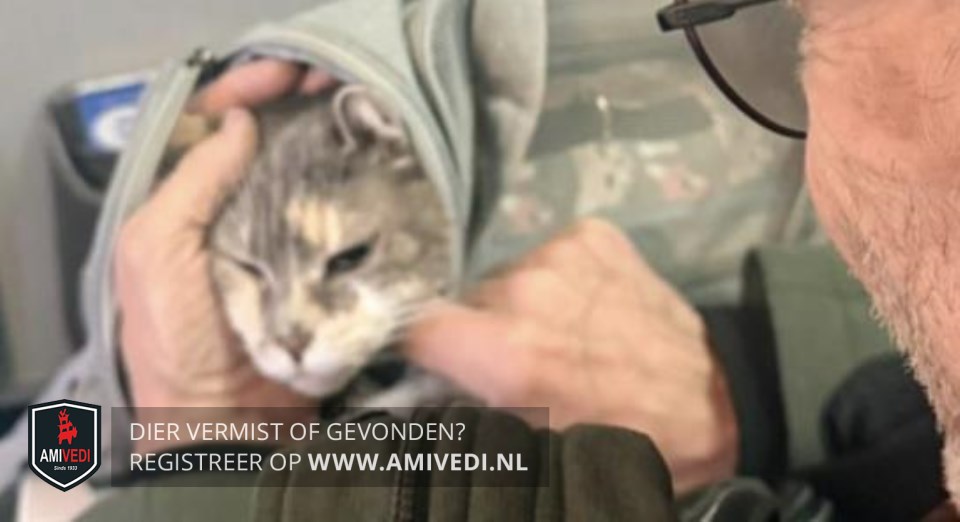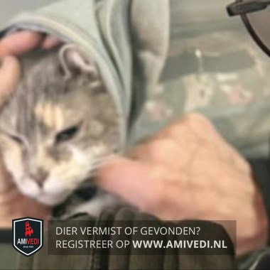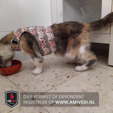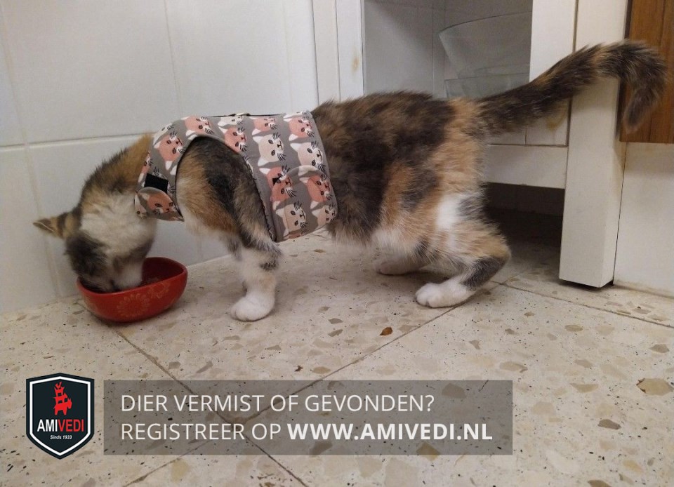| Signalement | Grijs/rood-oranje/wit. witte snoet en kin, Witte bef en borst. Uiteinde van de poten zijn wit. Rug en staart zijn grijs/rood gemêleerd. Draagt een tuig (Grijs met roze/beige poezenkopjes ) |