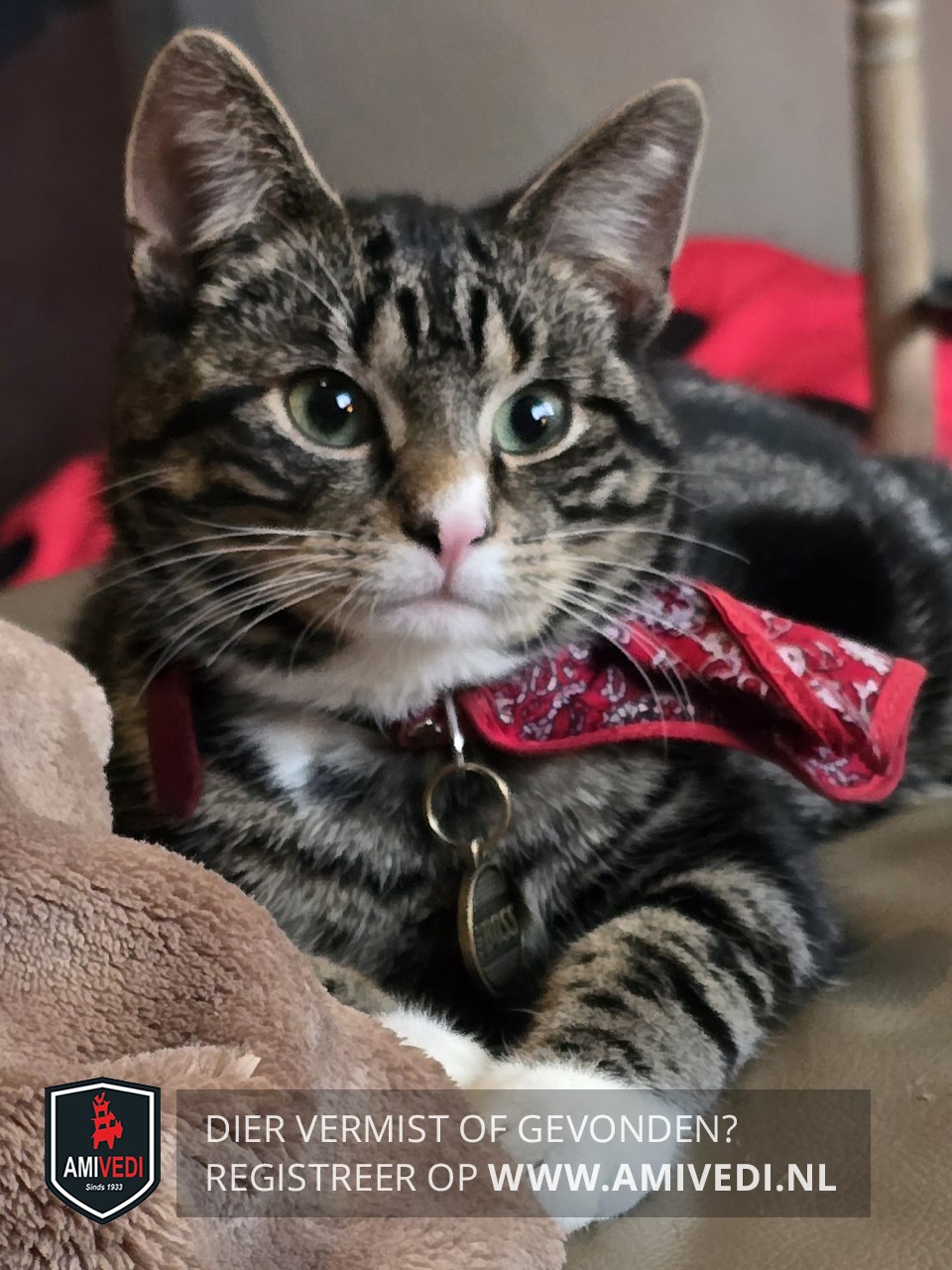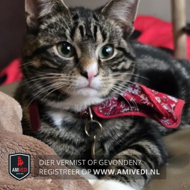 | Signalement | Cypers bruin/zwart wit plekje boven roze neus, snuitje, kin, keel, bef voorpoten witte voetjes. Halsbandje met een rood doekje eraan en een hangertje aan zijn halsband met de BOSS erop en op de achterkant staat zijn naam met mijn telefoonnummer. |