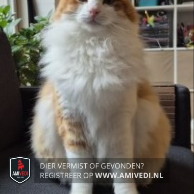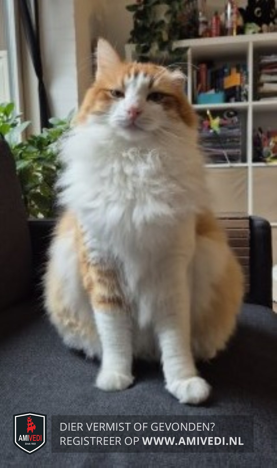| Signalement | Langharige wit met rode kat. Boven en nast oogjes rood. Rest kopje wit evenals hals, borst en buik. Linker voorpootje wit rechts wit laarsje. Mist zijn linker oor, die is verschrompeld |